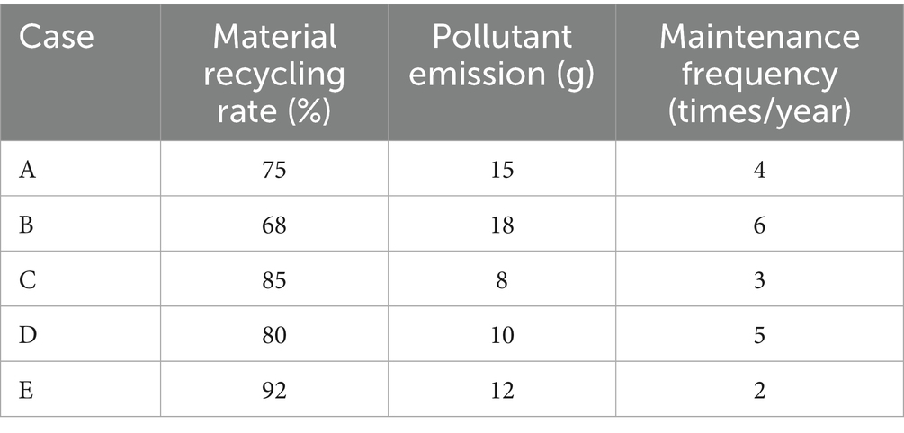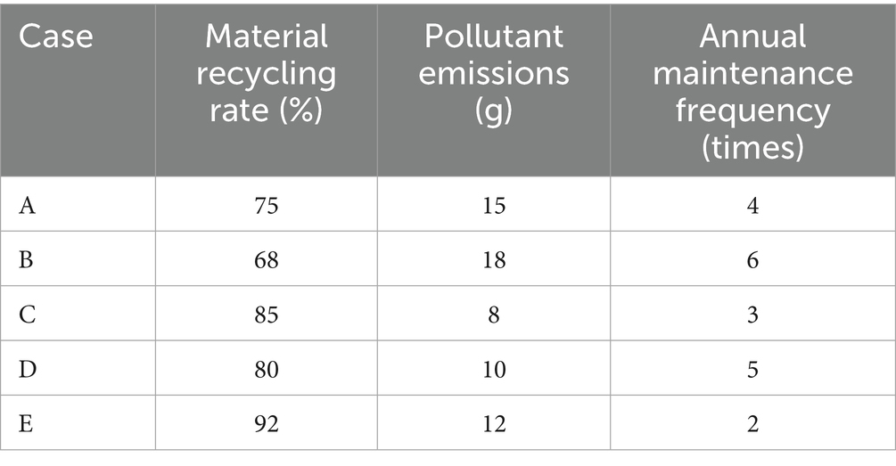 See Table 11 for the comparison between material recycling rate and pollutant discharge. The recycling rate of case E is as high as 92% due to the use of degradable composite materials, but its pollutant discharge (12 g) is higher than that of case C (8 g), which reflects that environmental protection and durability should be taken into account in material selection.