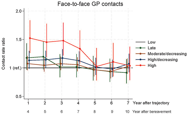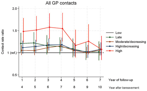 Relatives in other GT groups than the reference group (LGT) had more GP contacts during the first years of follow-up and the difference seemed to level out toward 10 years of follow-up (Figures 2, 3). Relatives in the LaGT had more overall contacts 4 and 5 years after bereavement, but no statistically significant excess face-to-face contacts compared to relatives in the LGT.