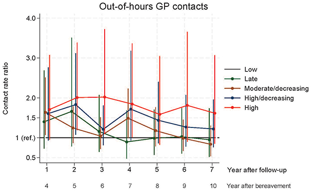 The contact pattern to out-of-hours GP services was diverging. These services are intended for acute situations and available free of charge to all citizens in Denmark (37). Hence, it is at first sight encouraging that persistent grief symptoms may not significantly affect the long-term use of these services as this could indicate that the supportive services provided during daytime sufficiently support the relatives. However, the connection between daytime consultation and out-of-hours use may be complex and those with need for mental health support might call helplines for mental health. A recent study showed that the use of out-of-hours GP services among citizens above 75 years of age was not lower if the patient had more daytime consultations in general practice (38), and personal characteristics rather than organizational factors were suggested to affect the use of out-of-hours GP services. Hence, out-of-hours contact may not be relevant health care for the participants.