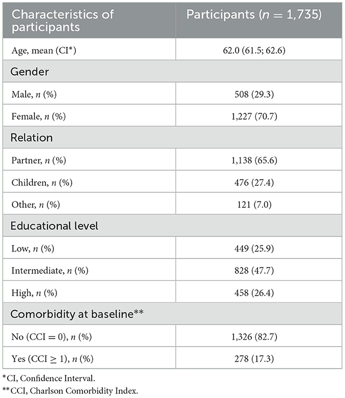 The study population of 1,735 persons included predominantly females (71%). In all, 1,138 were partners (66%), 476 (27%) were adult children and 121 (7%) had another relation to the patient. The mean age was 62 years, 449 (26%) had a low education and 17% had one or more comorbid diseases (CCI≥1) (Table 1).