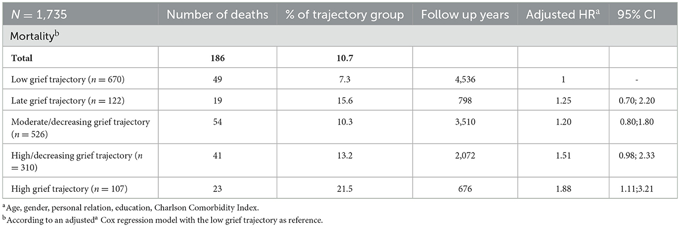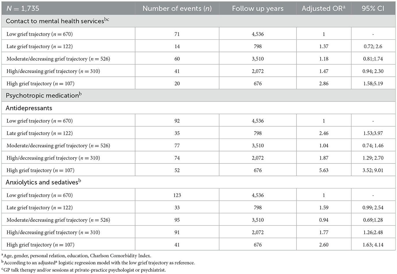 Method: We assessed grief symptoms using the Prolonged Grief-13 scale in a cohort of 1,735 bereaved relatives at three different time points (prior to bereavement, 6 months after bereavement, and 3 years after bereavement) and identified five main grief trajectories. The trajectory with persistent low levels of grief symptoms in relatives [n=670 (45%)] was called the low grief trajectory (LGT) and was used as reference. The high grief trajectory (HGT) consisted of 107 (6%) relatives with persistent high grief symptom levels. We investigated associations between grief trajectories and (1) contacts to general practitioner (GP) including out-of-hours using negative binomial regression analysis, (2) contacts to mental health services (GP talk therapy, private-practice psychologist or psychiatrist), (3) use of psychotropic medications (antidepressants, anxiolytics and sedatives) using logistic regression analysis, and (4) mortality using Cox regression analysis. The follow-up period started at 3 years after bereavement and long-term outcome were further followed until 10 years after the patient's death.