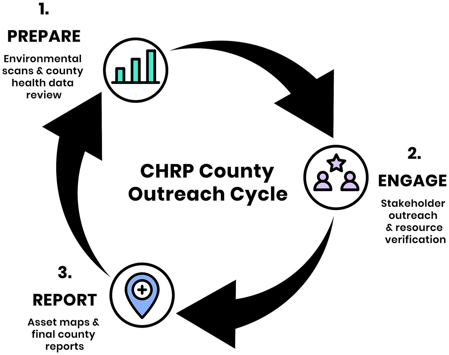 The team utilized a strengths-based approach to guide the design “Prepare, Engage, Report” (PER) process. Using CHNAs as an example of needs/deficits-based initiatives, the team adapted PAM and its capacity building and community development constructs for engagement with county residents (5, 15–17, 19, 20). As part of the CHRP design, the team researched which strategies were commonly implemented in rural areas. Studies and interventions that focus on rural health tend to factor morbidity and mortality rates when developing health solutions for this population as it’s important to understand risk factors when engaging with rural communities as a means to provide targeted solutions (5, 14–16). CHRP gathered health statistics of each county to understand the disparities, but used PAM to develop informative reports which highlighted strengths and opportunities.