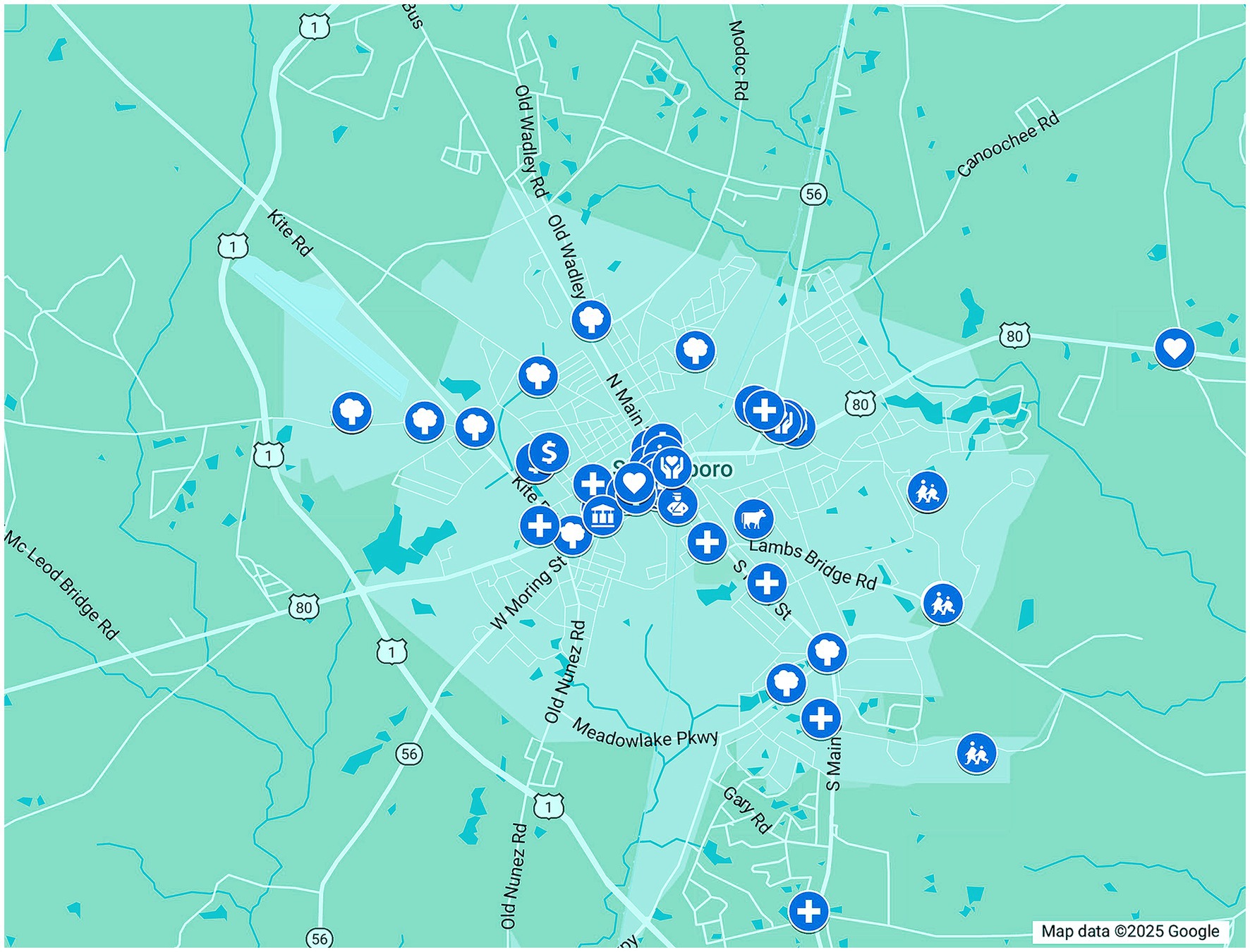 Figure 2. A screenshot of a portion of the Emanuel County asset map created using Google maps. The map displays verified community health resources across Emanuel County, Georgia, using icons to represent various One Health asset domains. Each icon is interactive, allowing users to explore detailed information about individual resources.