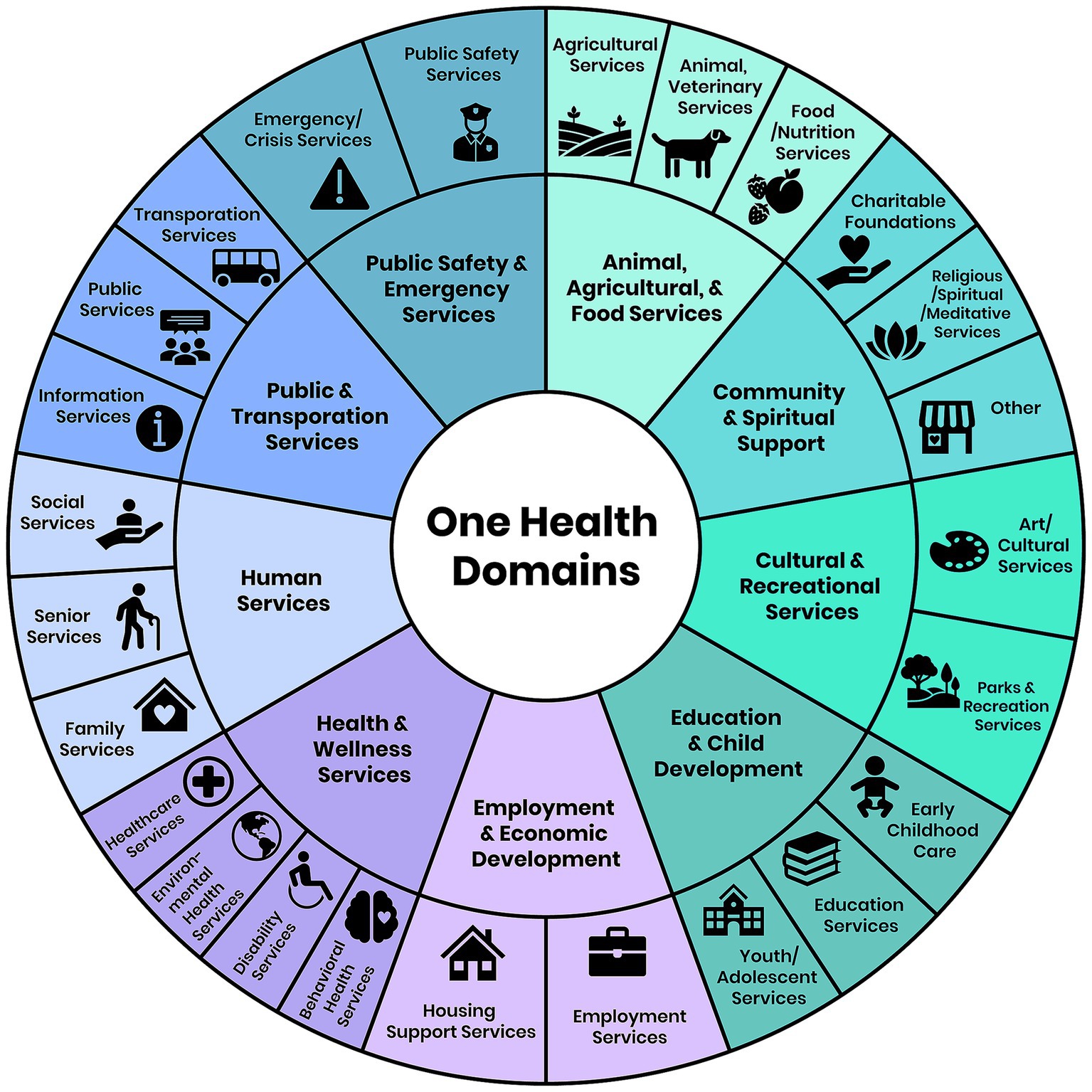 Quantitative and qualitative data throughout the program was collected using the CHRP Reporting Form and the CHRP Assets Form completed by the CHRP team members after the county engagement period concluded. The CHRP Asset Form was employed to categorize and organize identified resources according to One Health domains (Figure 3). Information was gathered about each asset’s name, verified asset address, One Health asset domain, contact information, and any unique services offered at this location using the One Health Asset Mapping Interview Guide (Supplementary File 1). The CHRP Reporting Form was used to document any CHRP activities in the county by CHRP team members, including targeted county, data of activity, type of activity (e.g., outreach, key insights, or other), and type of engagement used (e.g., phone calls, email, community event, meetings, focus groups, windshield/walking tour, drop-ins, and media interactions). Open-ended questions were also available for use to describe the activity in more detail, highlight moments that went well, document moments that did not go well, as well as an opportunity to describe recommendations stated by or interactions encountered with community members that will help address health–related workforce development efforts in their county.