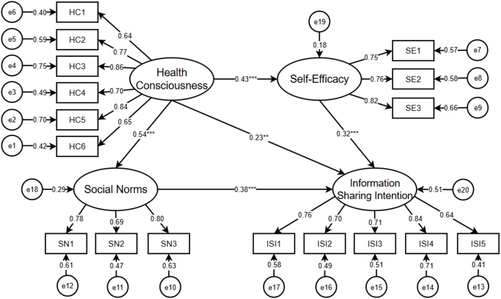 Results: The results show that older adults’ health consciousness, self-efficacy, and social norms have a significant positive effect on health information sharing. Health consciousness has a positive effect on social norms and older adults’ self-efficacy. Furthermore, social norms and older adults’ self-efficacy mediate the relationship between health consciousness and health information-sharing intention, respectively.