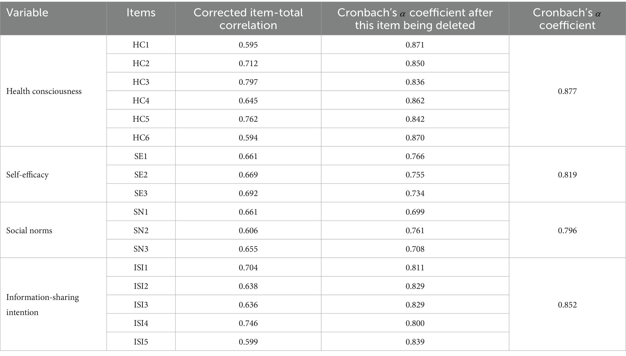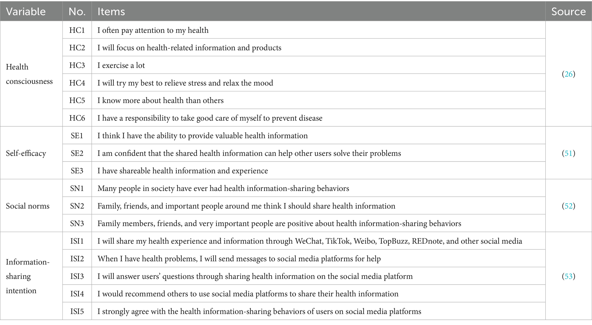 This study used the questionnaire method to systematically design and investigate the factors influencing Chinese older adults’ intentions to share health information on social media platforms. Before the respondents began to fill in the questionnaire, older adults who did not meet the subjects’ requirements were screened by setting the question “Have you used WeChat, TikTok, Weibo, TopBuzz, and REDnote.” The questionnaire contains the basic information and scale items (Table 1). The basic information includes gender, age, education, and occupation before retirement. The scale part contains the measurement items of four variables, such as health consciousness (26), self-efficacy (51), social norms (52), and information-sharing intention (53). All scales use the Likert five-level scale (1 = very disagree, 2 = disagree, 3 = uncertain, 4 = agree, 5 = very agree), reflecting the degree of conformity between the actual situation of the respondents and the description of the questions.