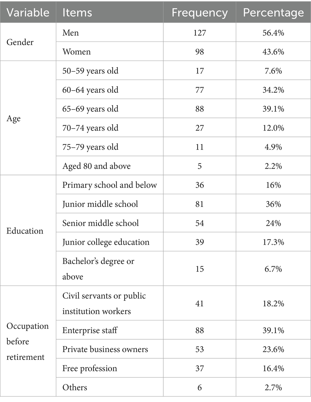 The research objects of this study were Chinese older adults over 50 years old who had used social media. The questionnaires were used to collect the information of the respondents. The distribution and collection of questionnaires were carried out online and offline from February to April 2023. The distribution of online questionnaires is based on “https://www.wjx.cn/,” an online questionnaire survey platform in China, and the offline collection sites are mainly distributed in some communities and parks with a dense population of older adults in China. A total of 248 questionnaires were collected. In this study, abnormal and invalid samples were excluded, including those with a response time of less than 60 s and those with the same option chosen consecutively for multiple questions. Finally, 225 valid questionnaires were included, which met the minimum sample size required for the study (54), with an effective sample recovery rate of 90.7%.