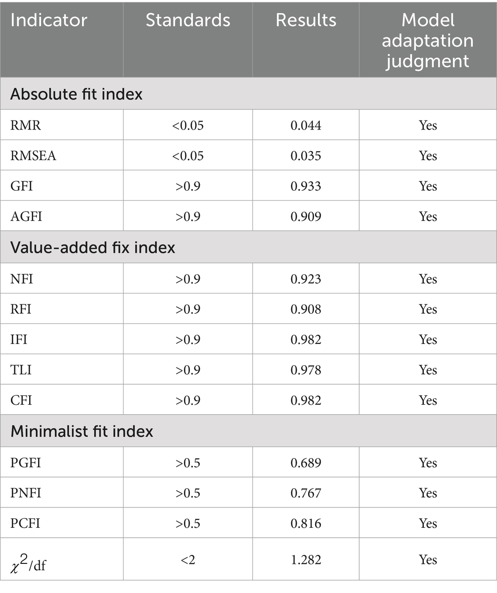 The fit of the model to the data was judged by the goodness-of-fit test. This test usually contains several important observation indicators, such as /df, GFI, RMSEA, RMR, and CFI, and when the model meets the above indicators, the fit of the model is good. According to the evaluation criteria of model fitting indicators, all fitting indices, including absolute fit indices such as RMR and RMSEA, and value-added fit indices such as NFI and TLI, and /df and PGFI, meet the criteria (see Table 4), so the model fit is good.