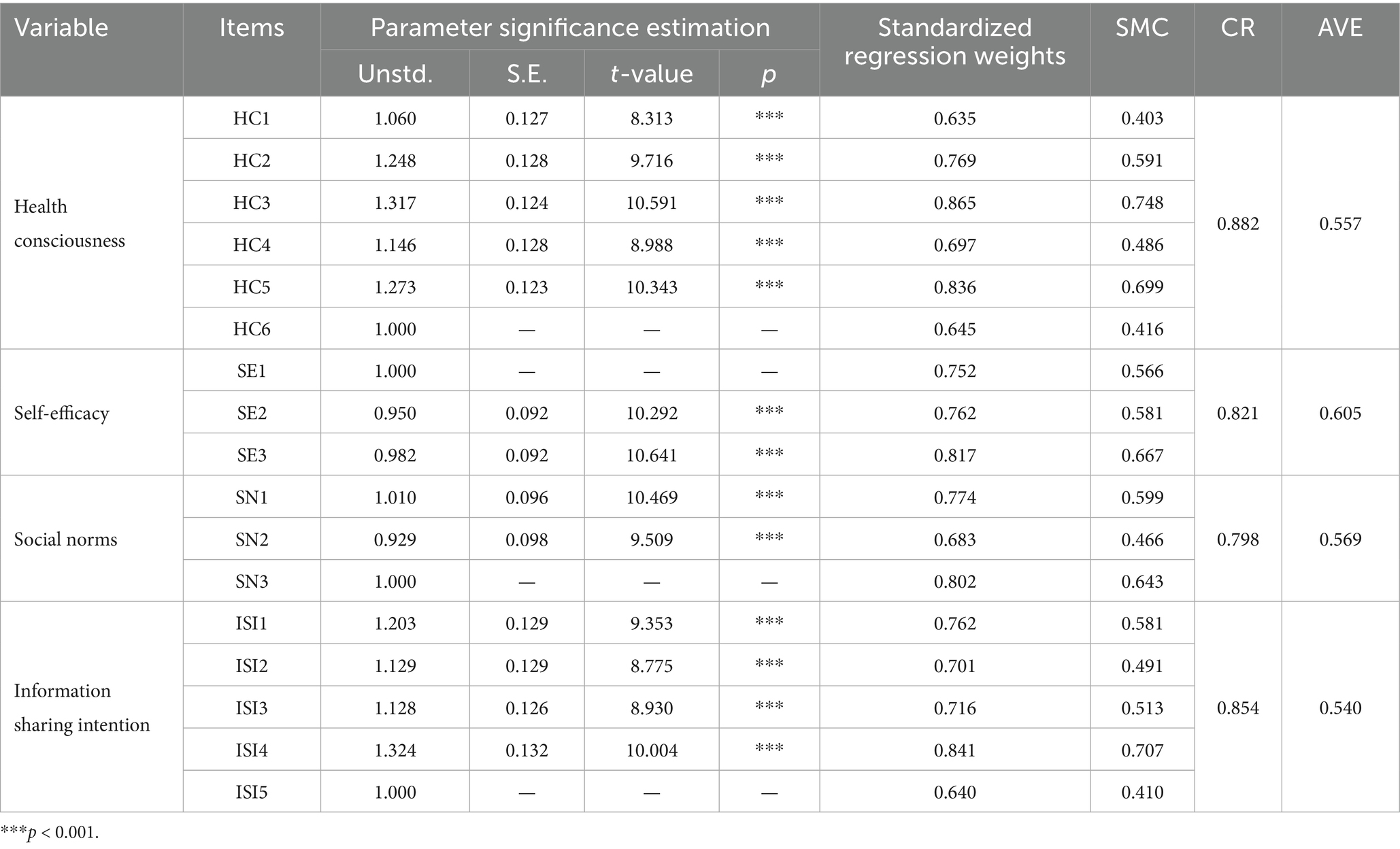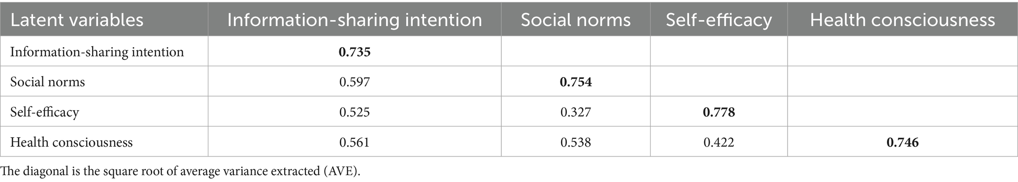 In the case that the questionnaire scale has a good fit, this study further tests the convergent validity of all dimensions of the scale. The standardized regression weights are greater than 0.6 and significant. In addition, the composite reliability (CR) value of the four variables of health consciousness, self-efficacy, social norms, and information-sharing intention is greater than 0.7. The average variance extracted (AVE) of the variables is greater than 0.5, and the square multiple correlations (SMC) value of all scale questions is not less than 0.36 (Table 5), indicating that the questionnaire scale of this study has good convergent validity.
