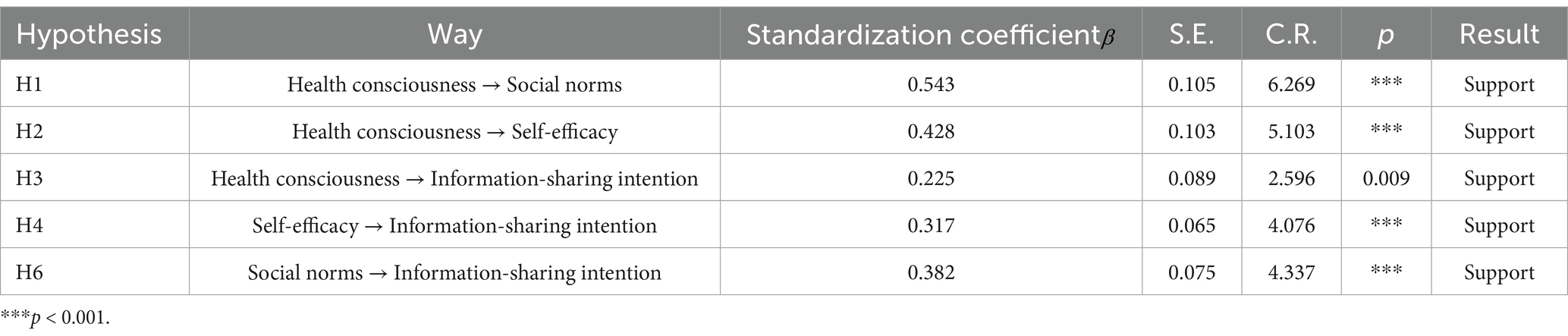 Considering the existing discussions on the impact of health consciousness on self-efficacy and the influence of self-efficacy on the intention to share information, this study infers that self-efficacy mediates the relationship between health consciousness and the intention to share information among older adults. For example, in addition to the direct and significant effects of self-efficacy on information sharing, self-efficacy also plays a mediator between self-connectivity and social media information sharing (39). Another study explained the mediation role of self-efficacy on the relationship between social support and resilience (40). Self-efficacy also plays a mediating role in the relationship between health literacy and quality of life in Tibet, China (41). Student self-efficacy can also play a mediating role between the learning environment and self-regulation (42). Based on the above analysis, the following assumptions are made: