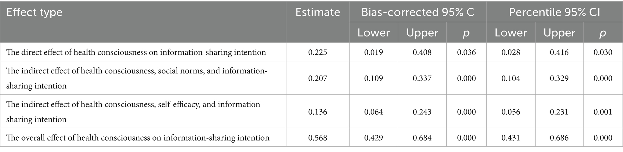 The bootstrap sampling method (55) was used to verify the mediation role of social norms and self-efficacy between health consciousness and information-sharing intention. We performed the 5,000 repeated sampling of the samples at the set 95% percentile confidence level and 95% bias-corrected confidence level and observed the upper and lower limits of the confidence interval for indirect effects. As shown in Table 8, the estimated values of health consciousness indirectly influencing information-sharing intention through social norms and self-efficacy were 0.207 and 0.136, respectively, and both passed the significance test (p < 0.05). The indirect effect and direct effect confidence intervals did not include 0, indicating that the mediation effect was significant and the partial mediation effect was proven. To be specific, social norms and self-efficacy partially mediate the relationship between health consciousness and information-sharing intention. Therefore, the hypotheses H5 and H7 are supported.