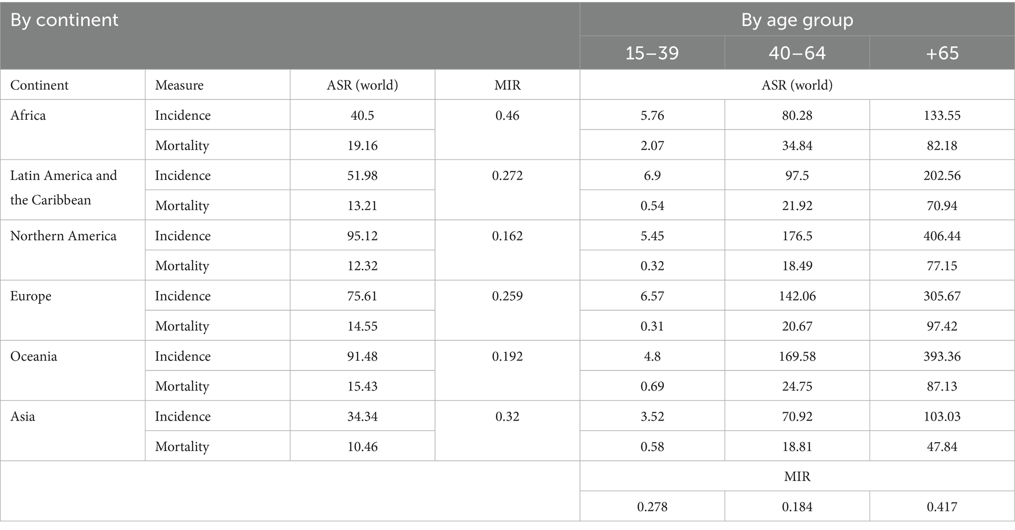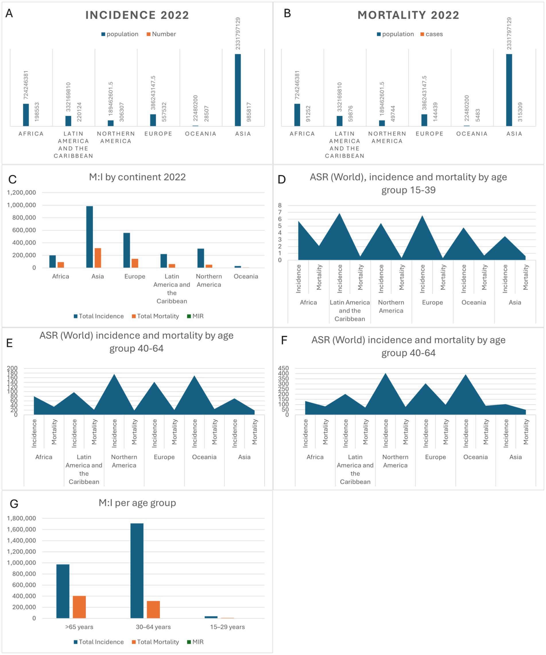 Figure 1. (A–C) Global incidence, mortality and MIR by continent in 2022. (D–G) incidence, mortality and MIR by age groups (15–39, 40–64, and +65).