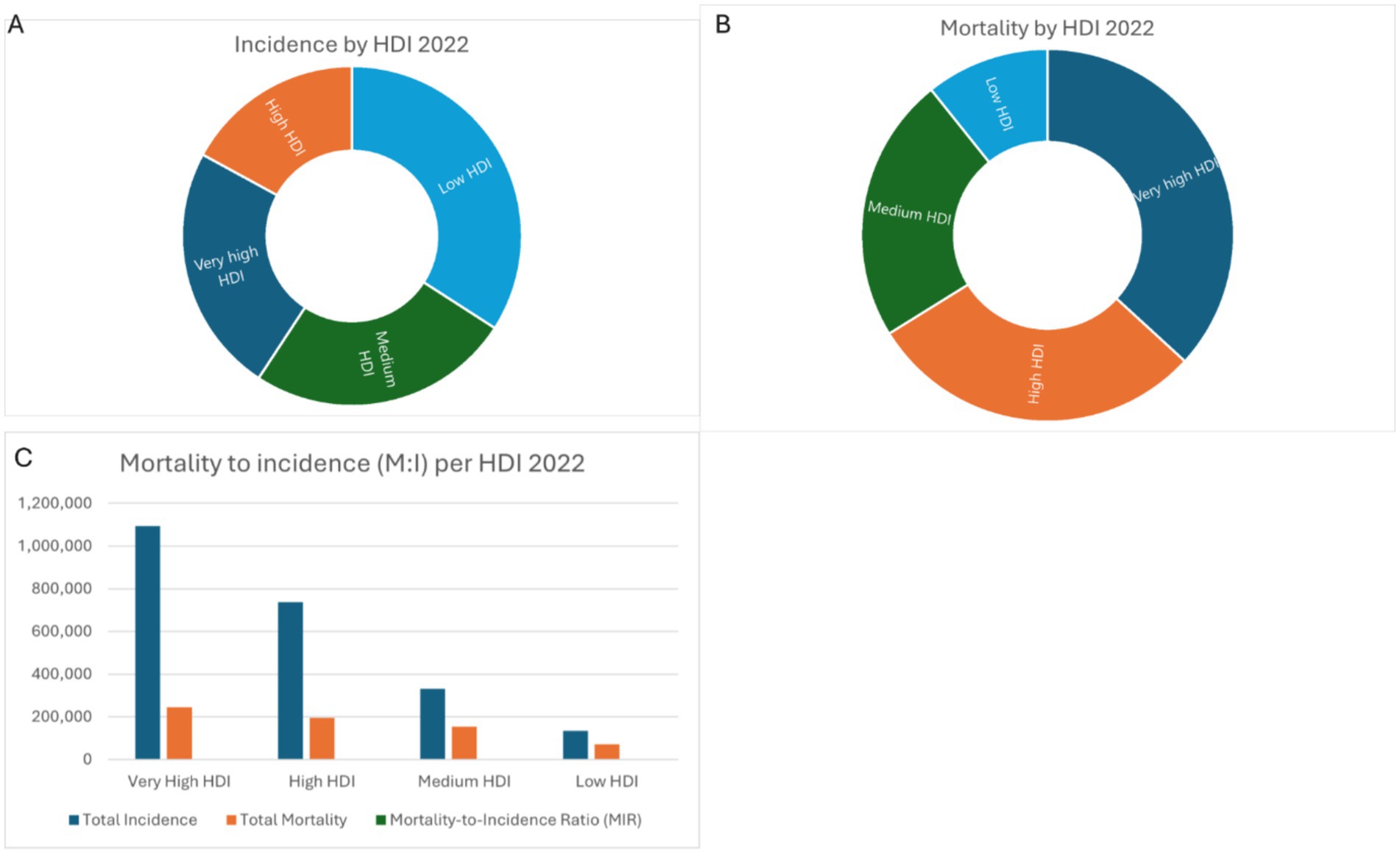 Three charts illustrate health metrics by Human Development Index (HDI) for 2022. Chart A shows a donut chart of incidence by HDI: low, medium, high, and very high. Chart B displays mortality by HDI in a similar format. Chart C is a bar graph depicting mortality to incidence ratios per HDI, highlighting total incidence, mortality, and mortality-to-incidence ratios for very high, high, medium, and low HDI.