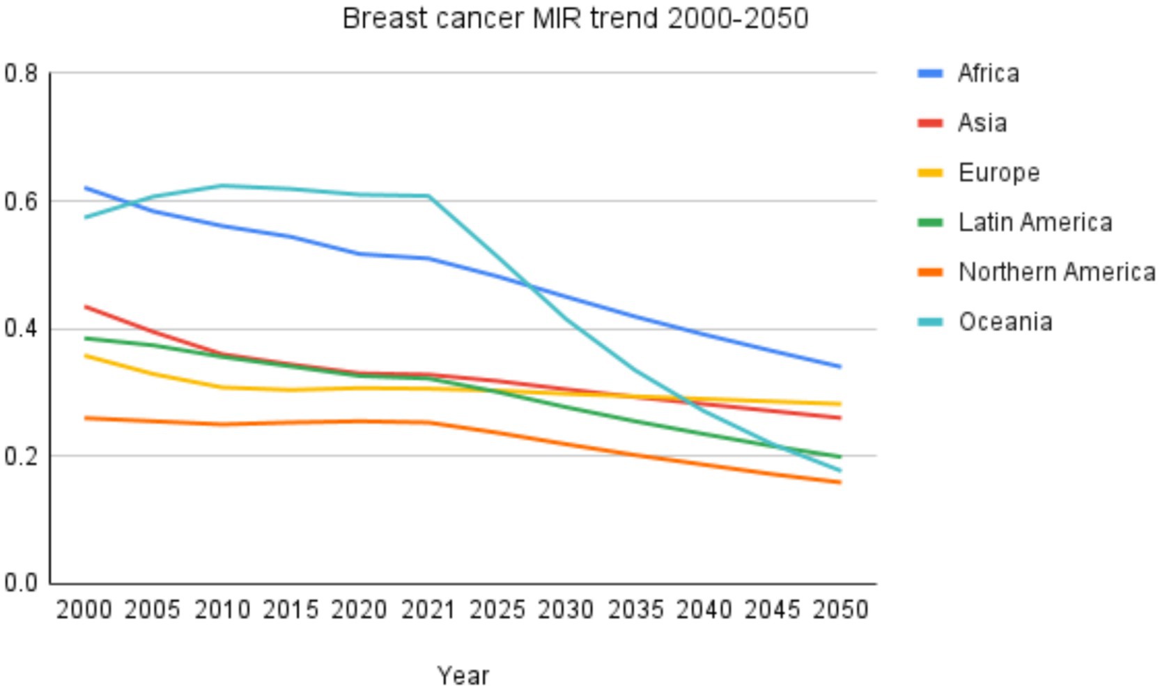 Line chart showing breast cancer MIR trends from 2000 to 2050 across six regions. Africa and Oceania start above 0.6 but decrease, with Oceania dropping sharply post-2040. Asia, Europe, Latin America, and Northern America show gradual declines, starting between 0.2 and 0.4.