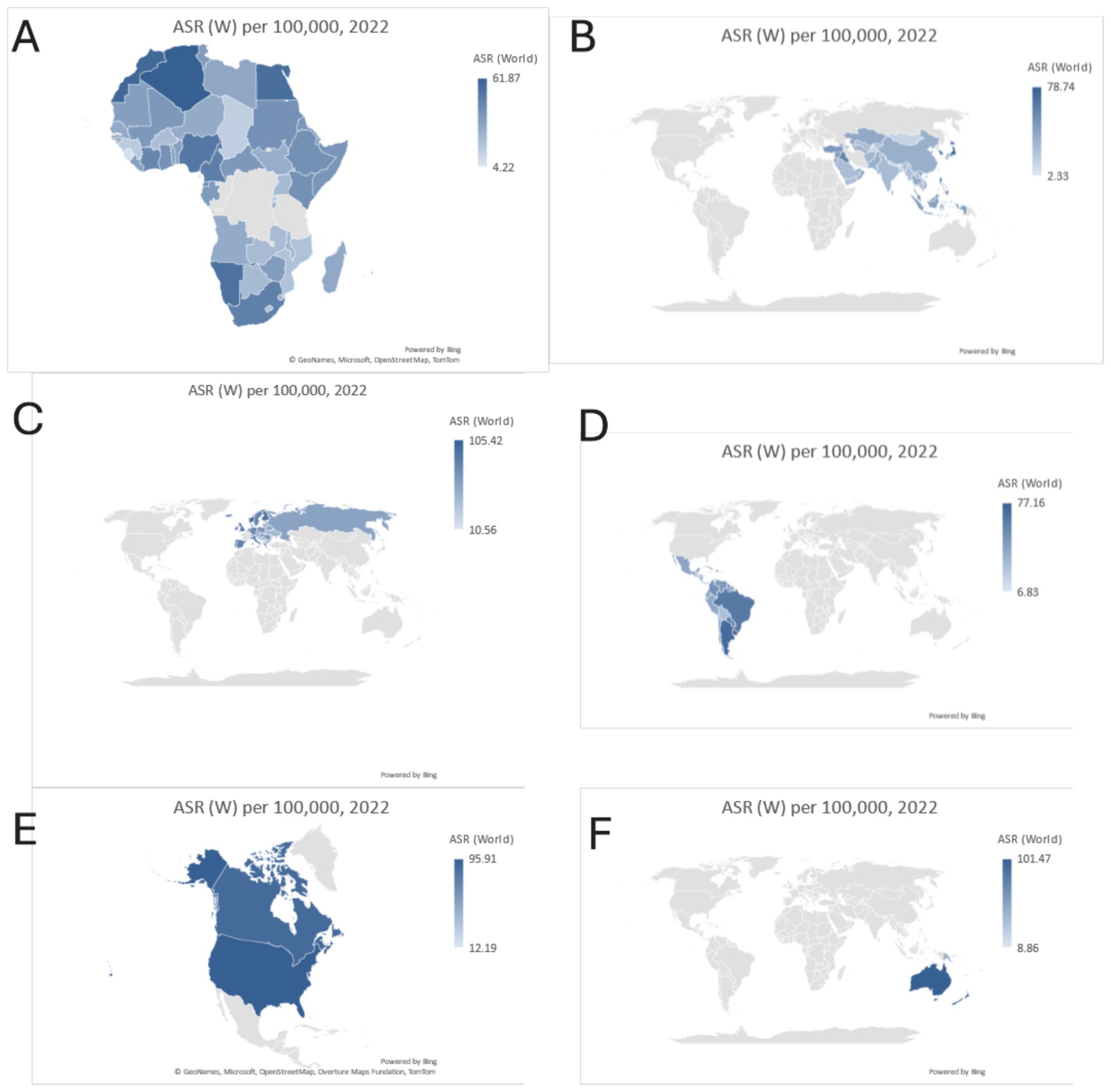 Panel A shows a map of Africa with varying ASR rates, ranging from 4.22 to 61.87. Panel B displays parts of Asia and the Middle East with ASR from 2.33 to 78.74. Panel C highlights Europe with ASR between 10.56 and 105.42. Panel D shows South America with ASR from 6.83 to 77.16. Panel E illustrates North America with ASR between 12.19 and 95.91. Panel F depicts Australia with ASR from 8.86 to 101.47, all for the year 2022.