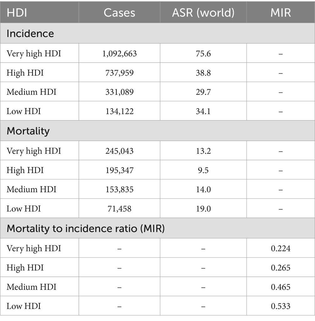 The burden of breast cancer is closely associated with levels of socioeconomic development, as measured by the Human Development Index (HDI). Regions with high HDI values, such as Northern America and Europe, report higher incidence rates but lower mortality due to access to organized screening programs, advanced treatment options, and improved healthcare infrastructure (9). In contrast, low- and medium-HDI regions, including parts of Africa and Asia, experience limited healthcare access, resulting in a higher proportion of late-stage diagnoses and poorer survival outcomes (27).