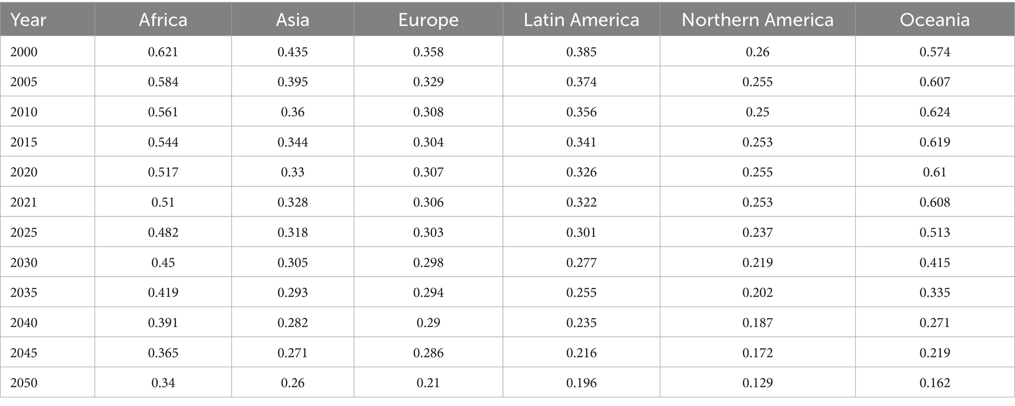 From 2000 to 2021, Africa’s M: I ratio declined from 0.621 to 0.510 but remains the highest, projected to decrease further to 0.340 by 2050. Asia’s MIR fell from 0.435 in 2000 to 0.328 in 2021 and is expected to reach 0.260 by 2050. Europe showed a decline from 0.358 in 2000 to 0.306 in 2021, with a modest further reduction to 0.282 projected by 2050. Latin America and the Caribbean’s MIR decreased from 0.385 to 0.322 over 2000–2021 and is projected to drop substantially to 0.199 in 2050. Northern America consistently exhibited the lowest MIR values, with 0.260 in 2000, 0.253 in 2021, and projected at 0.159 by 2050. Oceania, which recorded the highest MIR in 2010 (0.624), stabilized at 0.608 in 2021 but is projected to decline markedly to 0.177 by 2050. These trends are summarized in Table 4 and illustrated in Figure 3.