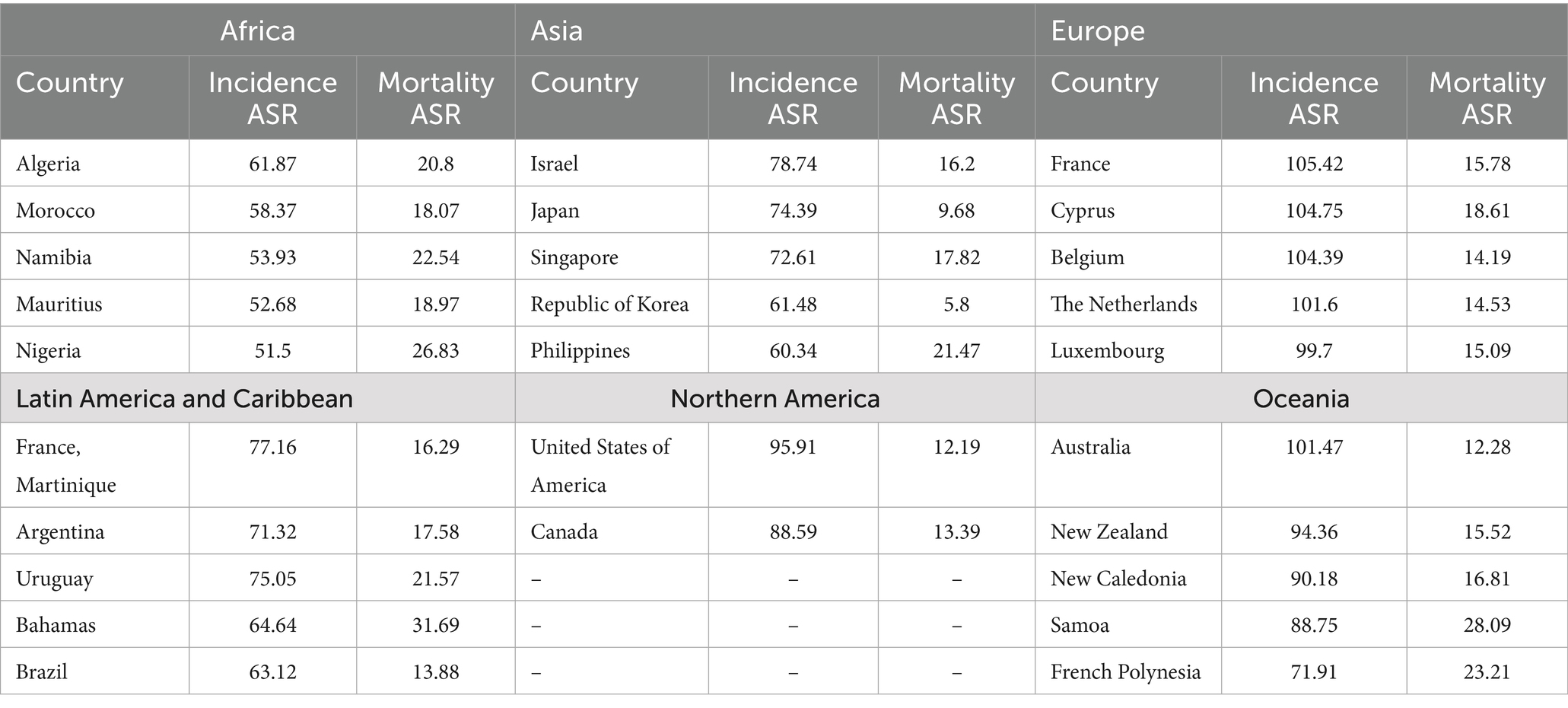 Europe has some of the highest incidence rates globally, with France (105.42 per 100,000) and Cyprus (104.75) leading. Mortality rates are comparatively lower, with Cyprus reporting the highest mortality among the top countries (18.61 per 100,000). These trends emphasize the importance of continued early detection efforts. (Table 5 and Figure 4C).