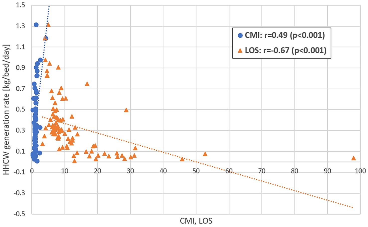 Figure 1. Spearman’s correlation between Case-Mix Index (CMI), Length of Stay (LOS), and hazardous healthcare waste generation rate (HHCW GR).
