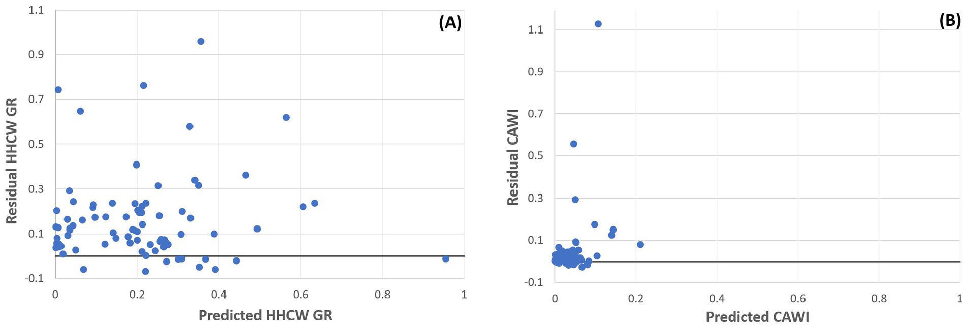 Figure 2. Residual plots of robust regression models comparing hazardous healthcare waste generation rate (HHCW GR) and the Complexity-Adjusted Waste Index (CAWI) across institutional control variables. (A) Residuals of the HHCW GR model. (B) Residuals of the CAWI model.
