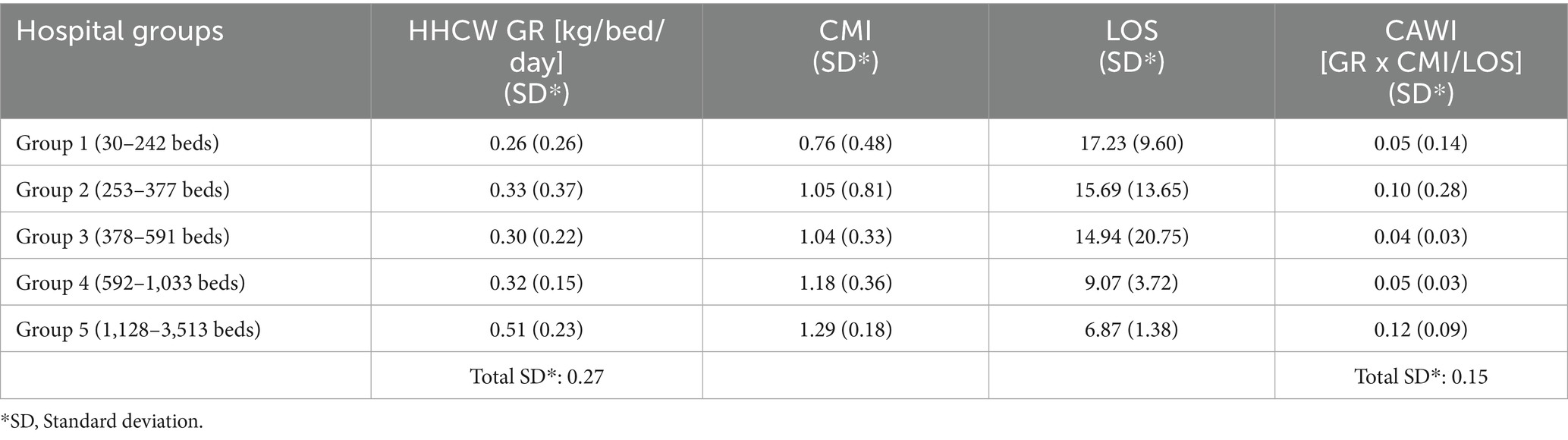 Table 1. Comparison of hazardous healthcare waste generation rate (HHCW GR), patient complexity (Case-Mix Index, CMI), and Length of Stay (LOS) across hospital size groups.