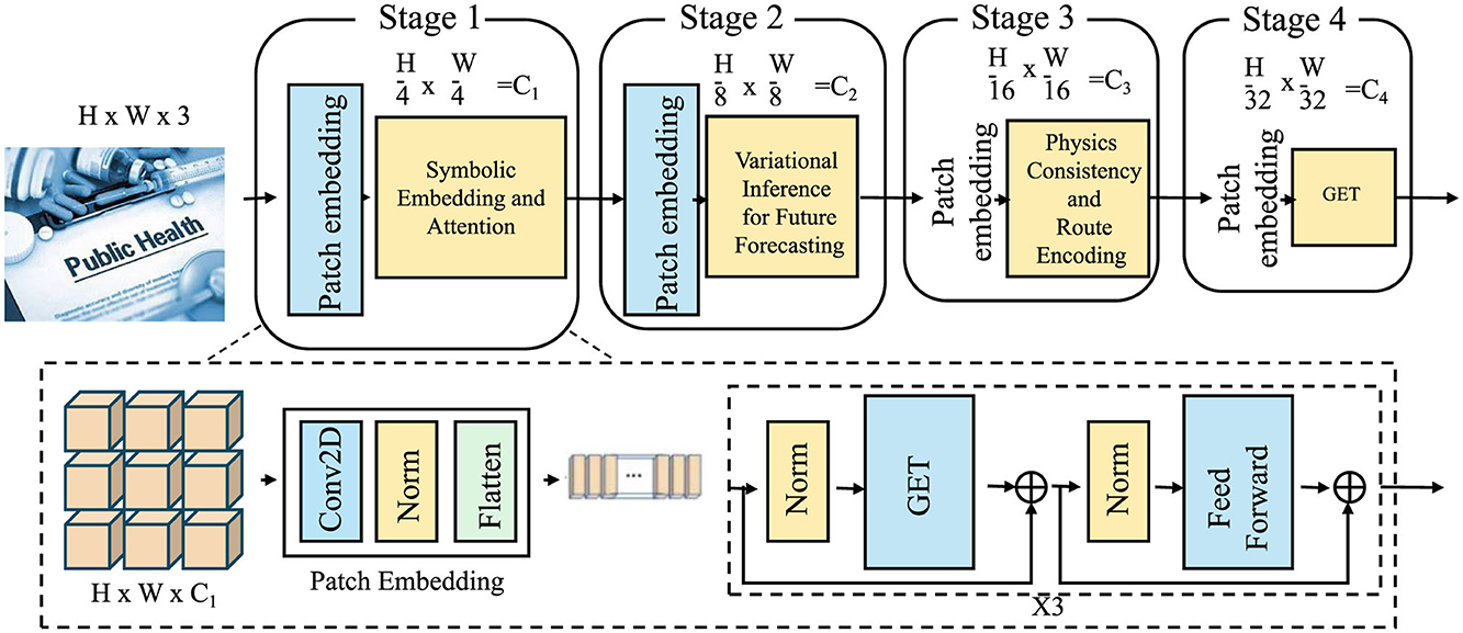 Figure 2. Diagram of the Geo-Event Transformer (GET) architecture, depicting the flow of data through four stages of patch embedding and the Geo-Event Transformer (GET) process. The diagram illustrates the use of convolutional layers, normalization, and feed-forward blocks, as well as the transformation of input dimensions at each stage, from H×W×3 to H/32 × W/32 = C4.