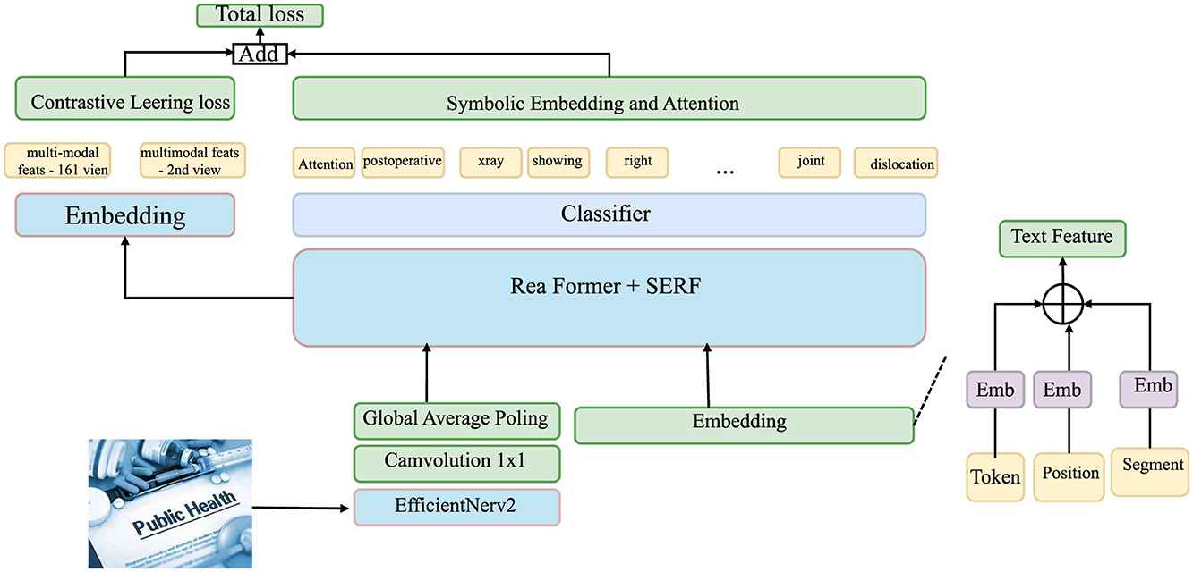 Figure 3. Diagram of the symbolic embedding and attention, illustrating the flow from multi-modal features through contrastive learning loss and symbolic embedding, to the final classification. The diagram highlights various components, such as the text feature embedding, Efficient Net V2, and the use of attention for symbolic embedding, leading to the total loss computation and classification.