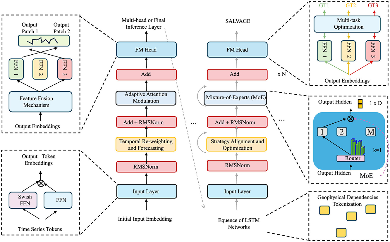 Figure 4. Diagram of the SAVAGE architecture, illustrating the flow of input through various components such as the Mixture-of-Experts (MoE), Feature Fusion Mechanism, and Multi-task Optimization. The diagram shows how adaptive attention modulation, temporal re-weighting, and forecasting are applied at different stages, leading to the final output hidden embeddings and geophysical dependencies tokenization. It also includes details about multi-head inference layers and the integration of time series tokens.
