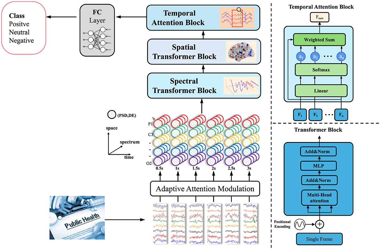 Figure 5. Diagram of the adaptive attention modulation. The diagram highlights the flow of data through the Adaptive Attention Modulation and the final classification into positive, neutral, or negative classes. It also includes the details of the Transformer block with multi-head attention, as well as the weighted sum and softmax operations for temporal attention.