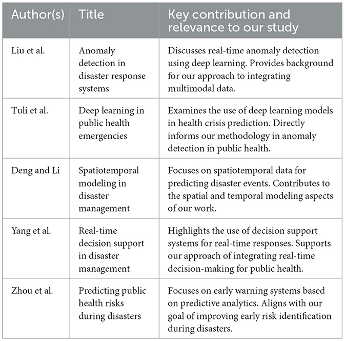 The Table 1 provides an overview of key studies related to anomaly detection and disaster response. It includes the author(s), year, title, key contributions, and their relevance to our study. The table highlights important works that inform our approach, such as real-time anomaly detection and spatiotemporal modeling. By synthesizing these studies, we identify existing gaps and demonstrate how our research extends current methodologies, particularly in integrating multimodal data and explainable AI. This review situates our work within the broader literature and shows its unique contribution to public health disaster response (as shown in Figure 1).