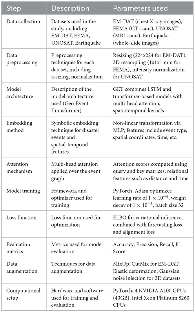 The Table 2 provides a structured overview of the key methodological steps, descriptions, and parameters used in this study. It outlines the datasets, preprocessing techniques, model architecture (Geo-Event Transformer), embedding methods, attention mechanisms, and training procedures, including hyperparameters like learning rate and batch size. Additionally, it details the evaluation metrics and computational setup. This summary ensures clarity and transparency, promoting reproducibility by clearly presenting the essential information required to replicate the study. It serves as a valuable resource for understanding the experimental setup and methodology.