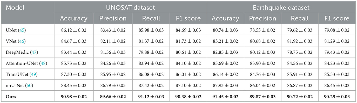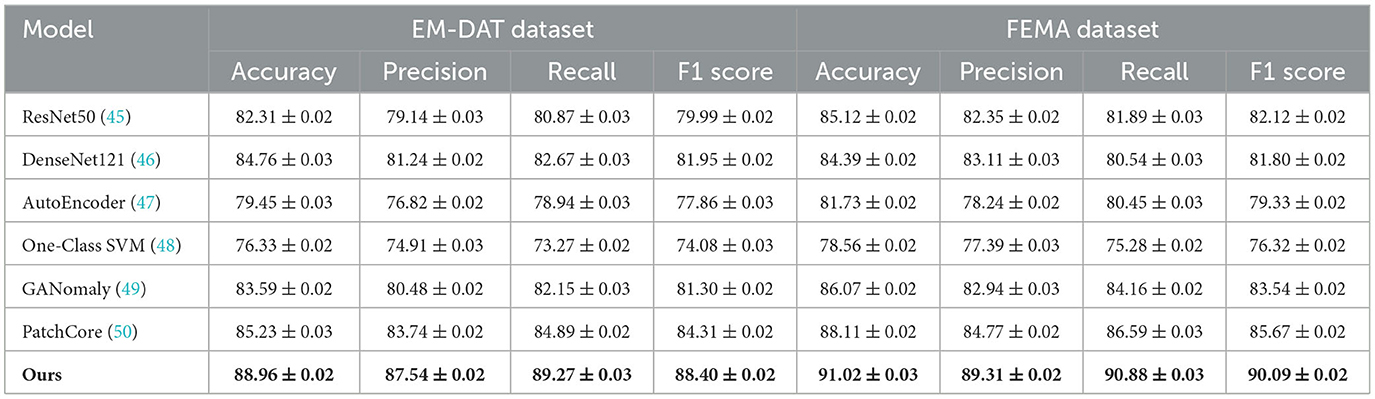 We present a comprehensive comparison between our proposed method and a range of state-of-the-art (SOTA) models across four benchmark datasets including EM-DAT, FEMA, UNOSAT, and Earthquake. Quantitative results are summarized in Tables 3, 4, respectively. For EM-DAT and FEMA, traditional CNN-based models like ResNet50 and DenseNet121 serve as strong baselines. Autoencoder and One-Class SVM represent anomaly detection paradigms, while GANomaly and PatchCore showcase generative and patch-based SOTA methods. For UNOSAT and Earthquake, segmentation networks such as UNet, VNet, and DeepMedic are compared alongside more recent architectures like Attention-UNet, TransUNet, and nnU-Net. Across all datasets, our method significantly outperforms existing techniques in terms of accuracy, precision, recall, and F1 score, with improvements ranging from 2.5% to over 6% in F1 score, indicating both robust prediction and generalization capabilities. For instance, on EM-DAT, our method achieves 88.40% F1 score, outperforming PatchCore's 84.31% and GANomaly's 81.30%. On FEMA, our model achieves 90.09% F1 score, clearly surpassing the next best PatchCore (85.67%) and GANomaly (83.54%). In segmentation benchmarks, we achieve 90.38% F1 on UNOSAT and 90.29% on Earthquake, where the nearest baseline nnU-Net scores 87.10% and 86.45%, respectively. This superior performance is not only consistent across datasets but also across evaluation metrics, emphasizing the broad applicability and robustness of our proposed approach.