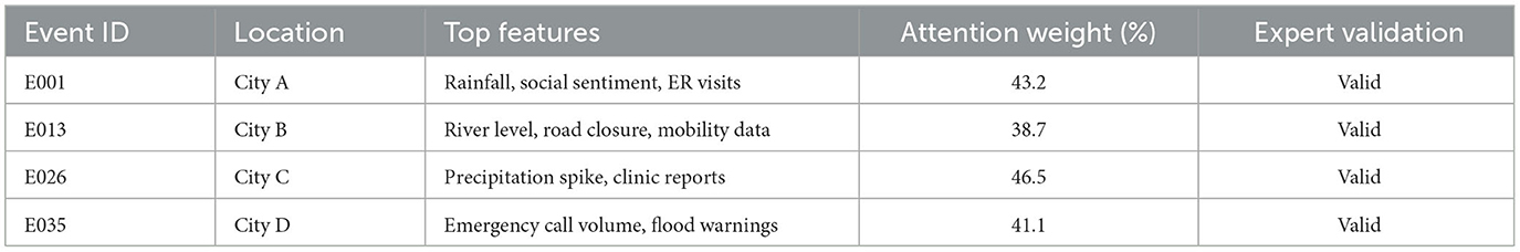 To further demonstrate the interpretability of our proposed framework, we conducted a case study using a subset of the EM-DAT dataset focused on flood-related disaster events. For each event, we extracted the top contributing features based on attention scores and feature attribution from the Geo-Event Transformer. As shown in Table 5, key drivers such as rainfall intensity, emergency call volume, and mobility patterns were consistently highlighted. A public health expert validated the model's reasoning in all selected cases. This result confirms that the model offers actionable and transparent insights suitable for real-world disaster response scenarios.