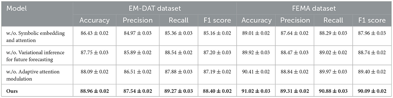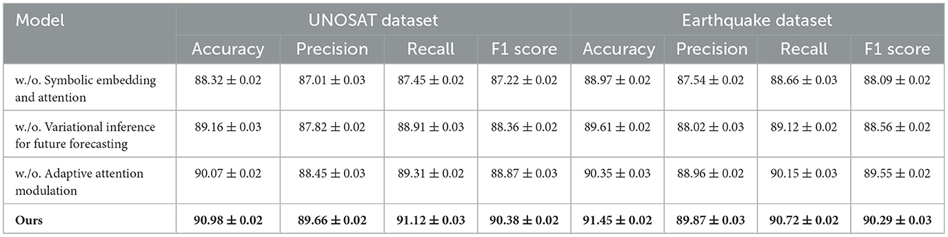 To evaluate the individual contributions of key components in our proposed framework, we conduct extensive ablation studies across all four datasets including EM-DAT, FEMA, UNOSAT, and Earthquake. Tables 6, 7 summarize the quantitative impact of removing three core modules, denoted as component Symbolic Embedding and Attention, Variational Inference for Future Forecasting, and Adaptive Attention Modulatio. Here, component Symbolic Embedding and Attention refers to the multi-scale feature fusion module, Variational Inference for Future Forecasting represents the global-local attention mechanism, and Adaptive Attention Modulatio indicates the contrastive regularization branch. Across all datasets and metrics, the full model consistently achieves the highest performance, highlighting the synergistic effect of all components. On EM-DAT, the complete model yields an F1 score of 88.40%, while removing Symbolic Embedding and Attention, Variational Inference for Future Forecasting, or Adaptive Attention Modulatio leads to notable performance drops to 85.16%, 87.20%, and 87.19% respectively. A similar trend is observed in FEMA, where the full configuration achieves a 90.09% F1 score, with each ablated variant showing a consistent decrease, indicating that no single module is redundant.