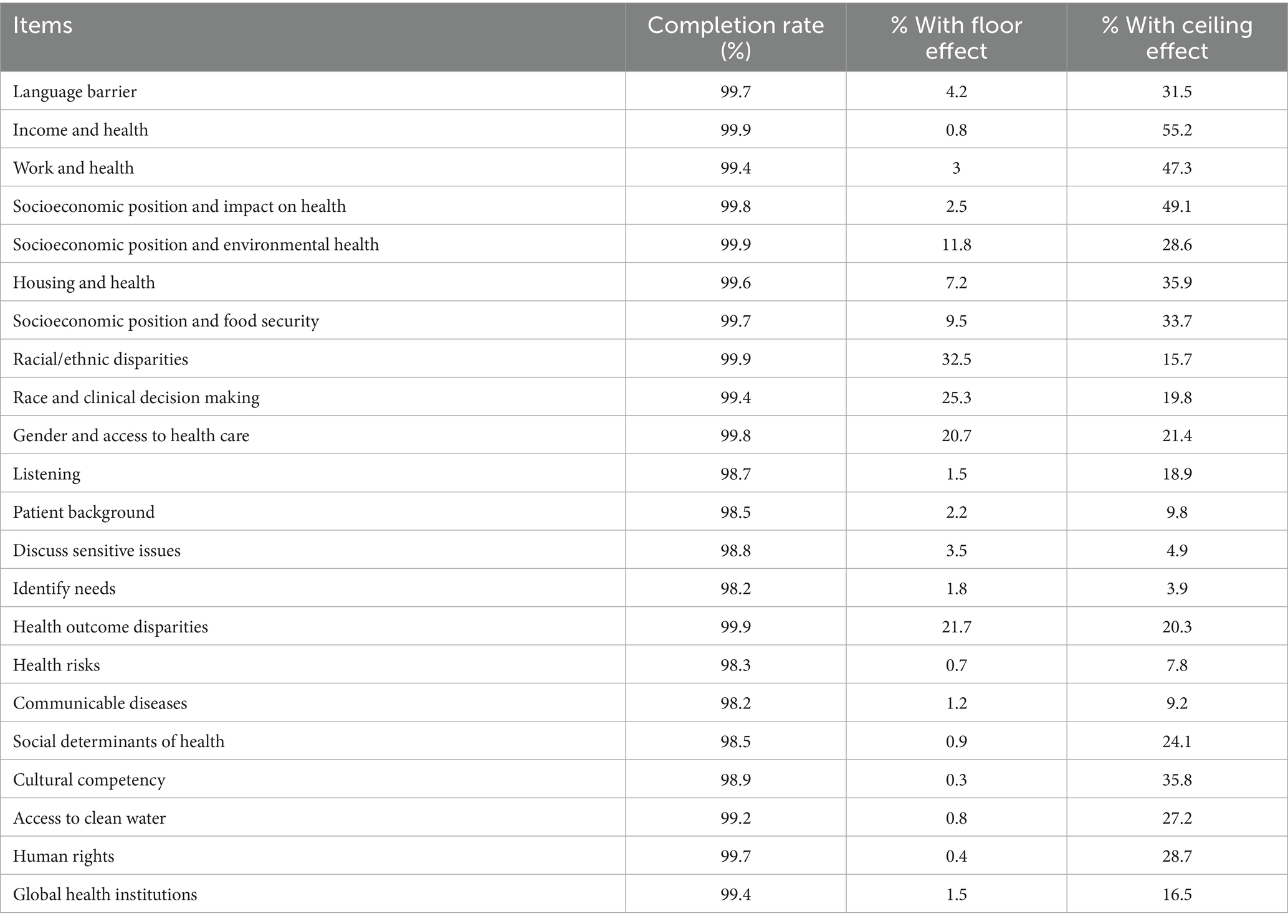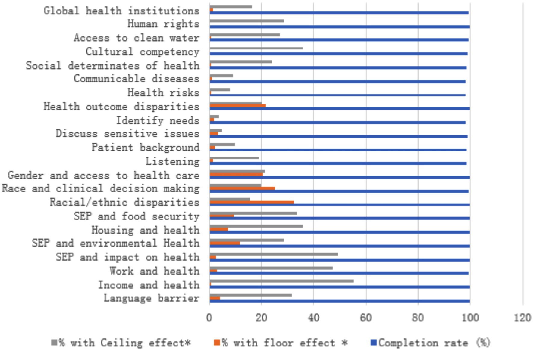 Key areas of strength among Chinese professionals included cultural competency, awareness of global health institutions, and understanding of social determinants of health—reflecting China’s growing engagement in global health education and international collaboration. The absence of ceiling and floor effects in most domains confirms the tool’s suitability for capturing the full range of competencies.