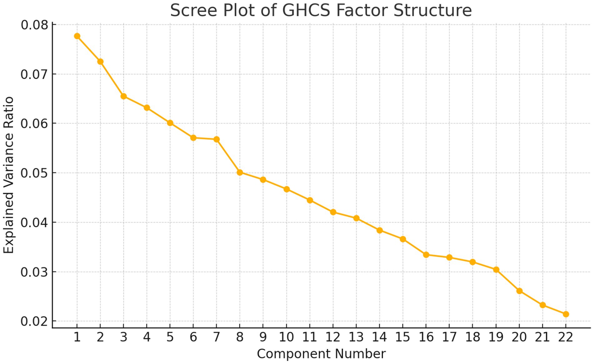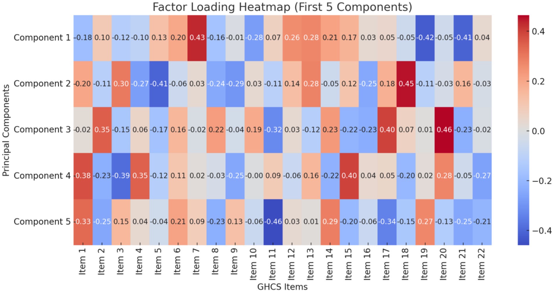 Figure 3 is the factor loading heatmap for the first 5 components of the GHCS. This visualization shows how strongly each item correlates with each principal component, offering insight into the underlying factor structure.