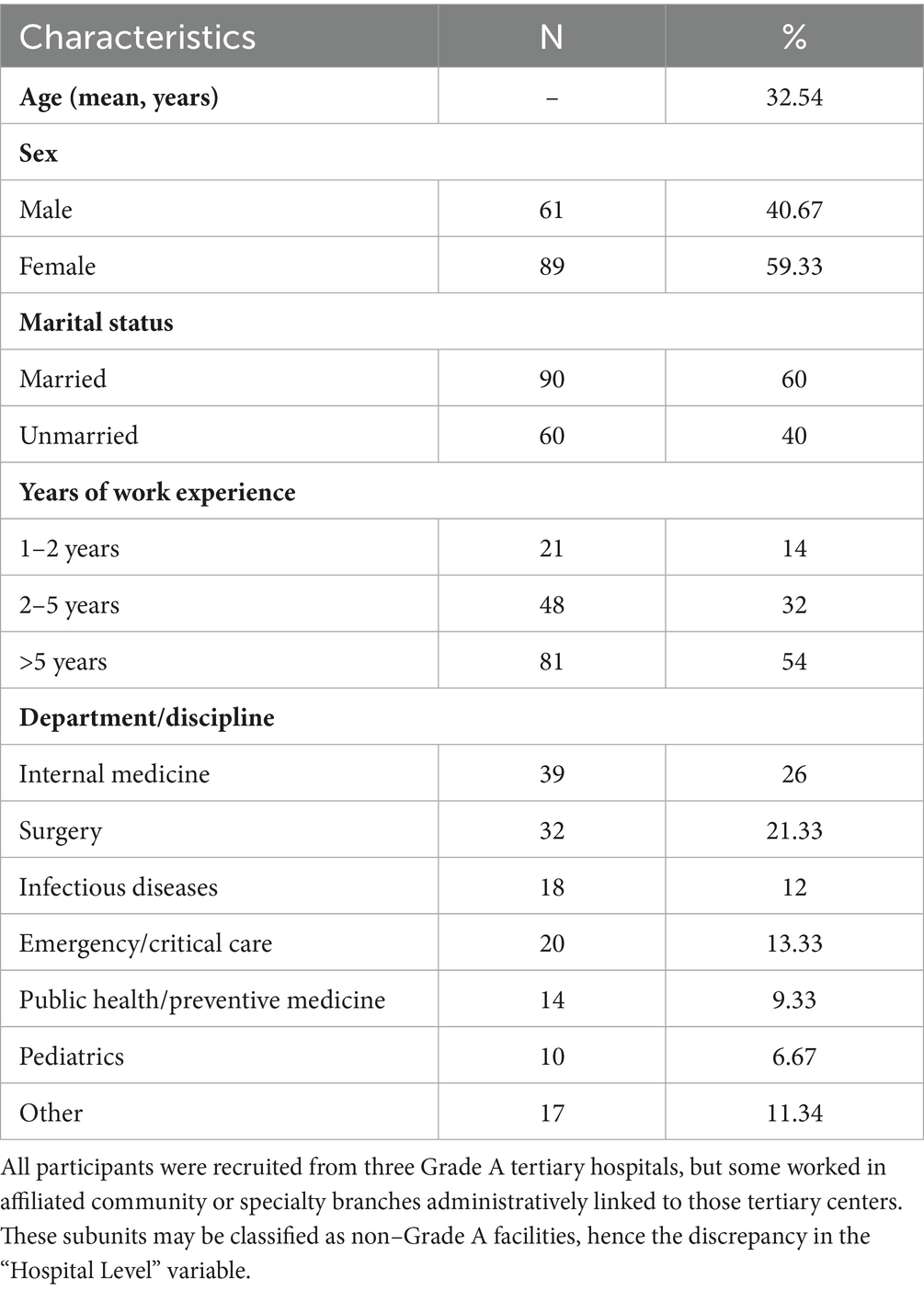 The study enrolled a total of 150 healthcare professionals from three Grade A tertiary hospitals in China. The participant pool reflected a professionally diverse cohort, including physicians (n = 50), nurses (n = 60), and allied health professionals (n = 40) such as rehabilitation therapists, pharmacists, and medical technologists. This multidisciplinary composition was intended to ensure broad representation across different functional roles in healthcare delivery.