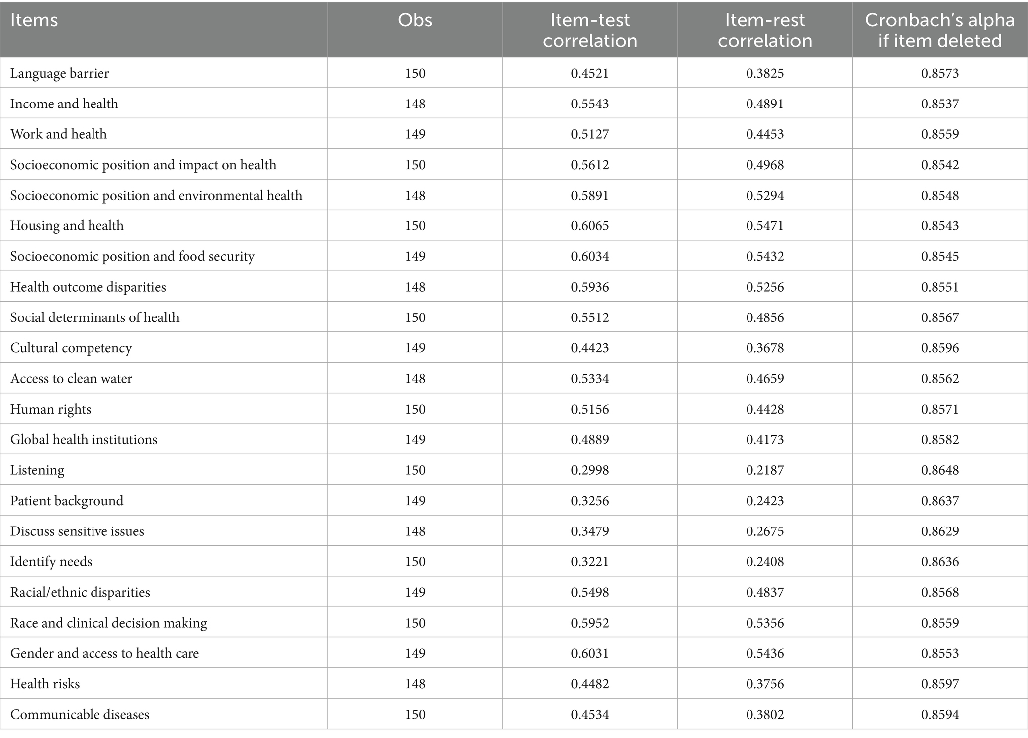Notably, Chinese healthcare professionals scored particularly high in domains such as cultural competency, knowledge of global health institutions, and social determinants of health. These results echo the growing national emphasis on international health collaboration, health diplomacy, and global health education initiatives in China (22, 23). Compared to previous validations, our study achieved stronger psychometric performance, potentially due to a more comprehensive cultural adaptation process, including iterative expert review and semantic refinement, as recommended by Ramada-Rodilla et al. (24).