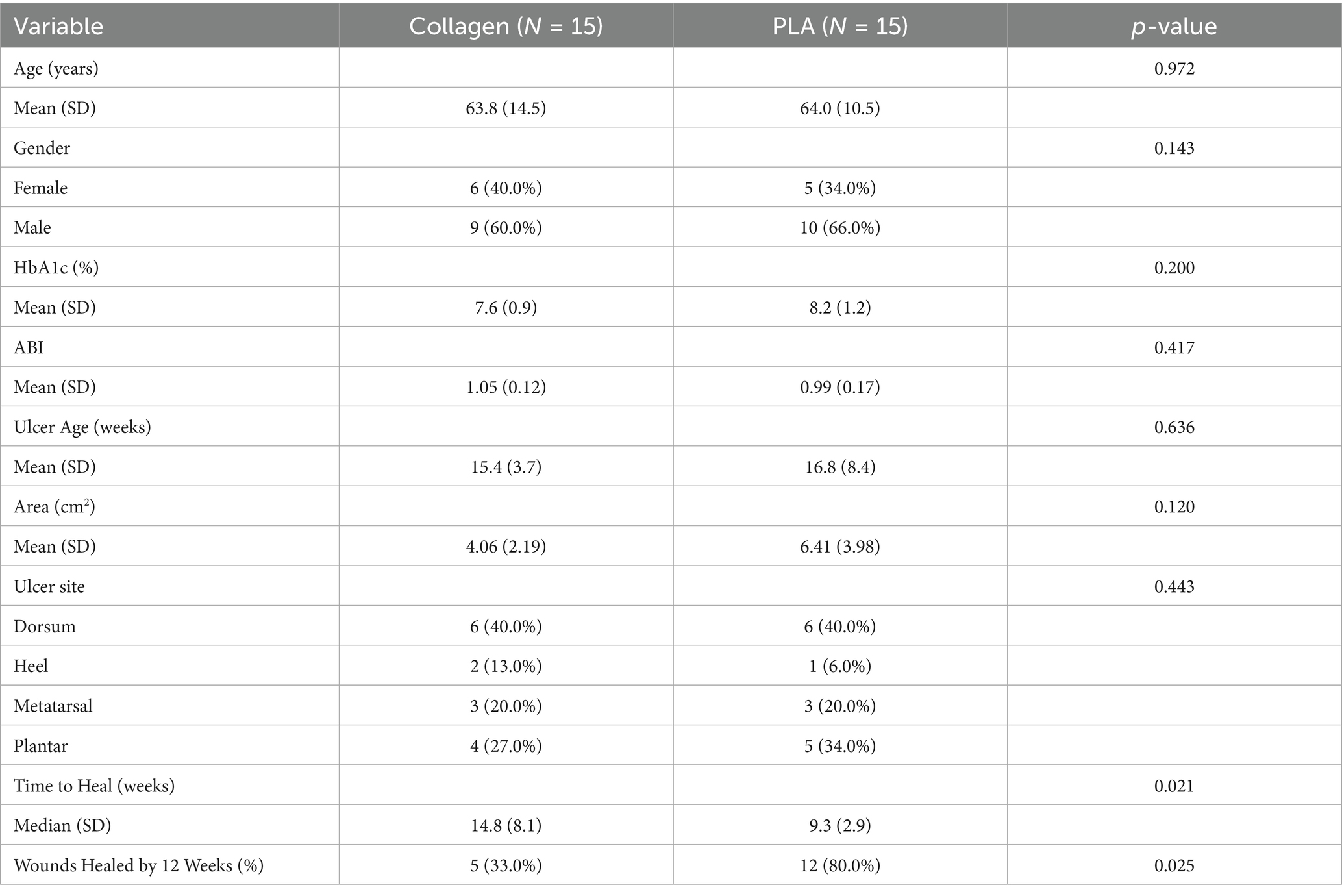 The primary data for this analysis was sourced from the RCT conducted by Liden and Ramirez-Garcialuna in 2023 (11). This study compared the healing outcomes of standard of care wound care plus either PLA matrices or collagen dressings over a 28-week period in a sample of 30 patients (15 per arm). The trial was registered with ClinicalTrials.gov (NCT05883098). The trial was approved by WCG Clinical IRB (Protocol Number 20230304). The studies were conducted in accordance with the local legislation and institutional requirements. The participants provided their written informed consent to participate in this study. The analysis followed ethical standards, and all participants provided informed consent prior to enrollment. It followed a parallel-group design where patients with DFUs were randomly assigned to receive either weekly applications of PLA matrices (Supra SDRM, Polymedics Innovations, Denkendorf, Germany) or collagen dressings (Fibracol Plus, 3M) until healing, in addition to standard care consisting of debridement, wound care, and offloading with a walking boot. Although it is not considered a CAMP, collagen dressings have widely been considered the clinical standard of care for advanced wound management and are traditionally the comparison standard in most clinical trials (14). Inclusion criteria included a single Wagner grade 1 or 2 DFU with a duration of 12 weeks to 12 months and a size of 1 to 25 cm2. Patients were required to have an HbA1c < 10% and an ankle-brachial index (ABI) between 0.7 and 1.3 within 2 months of randomization. Offloading of the ulcer for a minimum of 14 days before randomization with a size reduction of <20% was also required. Exclusion criteria included active wound infections, gross edema, uncontrolled comorbidities, or the use of drugs that would modify wound healing. Elimination criteria included the development of infections requiring systemic antibiotics and the loss to follow-up for two or more consecutive visits.