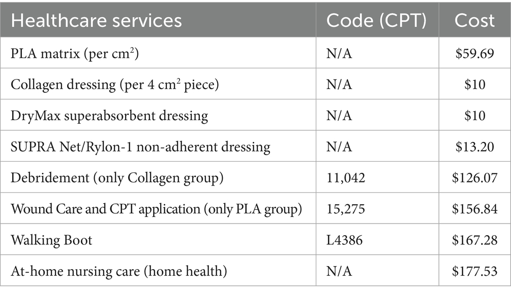 Cost data for this analysis were sourced from the Centers for Medicare & Medicaid Services Physician Fee Schedule for the State of Ohio, based on the 2022 cost listings, as the trial was done during this year. The direct medical costs included debridement for collagen dressings based on current procedural terminology (CPT) codes 11,042 and 11,045 or wound care for PLA matrices based on CPT code 15275, which includes the debridement procedure and the application of a CAMP. Walking boots under CPT code L4386 were used for both groups. These CPT codes correspond to the procedures routinely invoiced in the United States for debridement, wound care, and application of cellular- and tissue-based products. They are assigned and maintained by the American Medical Association and are enforced by insurance carriers and government payers such as Medicare. Their inclusion in the study ensures that the cost calculations accurately reflect real-world billing practices for both treatment arms. Additional wound care materials, such as non-adherent dressings (SUPRA Net/Rylon-1, Polymedics Innovations, Denkendorf, Germany), superabsorbent dressings (DryMax Extra, MPMMed, Mesquite, TX), and offloading devices (CAM walking boot), were also factored in, along with the costs of home nursing visits for wound care management. A detailed list of codes and costs associated are presented in Table 2. Two critical time points were used to assess costs: the 12-week mark, where most patients treated with PLA matrices had achieved wound closure, and the full healing time for patients in both the PLA matrices and collagen dressings treatment groups.