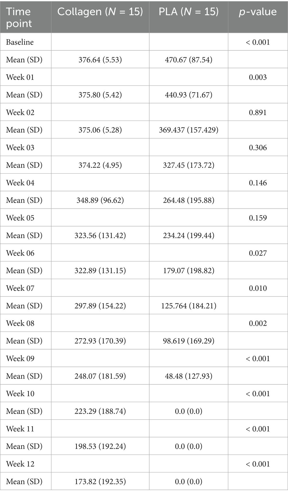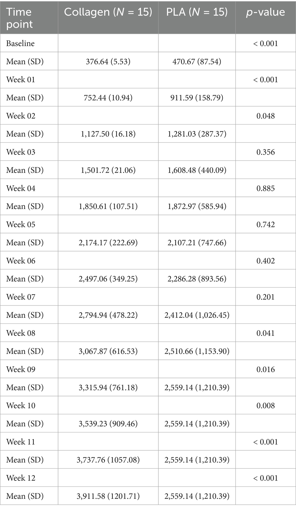As illustrated in Figure 4B, PLA patients had no additional costs beyond the 12-week mark, while collagen patients continued to incur costs until the 28th week. This difference in treatment duration underscores the cost-efficiency of PLA. The cost at week 12 was $3,976 for collagen and $2,961 for PLA, with a mean difference of $1,015 (95% CI 109.08 to 2,032, p = 0.041). A sensitivity analysis excluding home visit costs further confirmed that collagen treatment remained more expensive than PLA, even when wastage was accounted for.