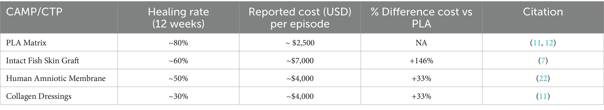 It is important to recognize that DFU management does not follow a “one size fits all” approach. Rather, it encompasses a broad spectrum of disease severity, ranging from superficial, uncomplicated ulcers to deep, infected, and ischemic wounds requiring advanced interventions. This heterogeneity influences both clinical outcomes and economic impact, limiting the extent to which results from a single study can be generalized. However, when compared to published data, the cost benefits of PLA are still clear. CAMPs are effective in treating DFUs, with some studies indicating potential cost-effectiveness (19, 20). However, the cost-effectiveness of CTPs varies widely, with healing rates ranging from 28 to 68% and treatment costs per DFU in the office setting, ranging from $1,207 to $8,791 (21). With a mean total cost of $2,989 for healing a DFU, PLA is in the lower end of this spectrum, with the much higher advantage of having a healing rate of 80 to 85% (11, 12). Furthermore, when compared to amnion-based products, which have a mean clinical effectiveness of 50% and a mean 12-week cost of $4,149 (22), at $2,961 for a similar period, PLA is 33% less costly. Furthermore, when compared to newer generation CAMPs, such as fish skin grafts, PLA has a much greater cost-effectiveness. The total cost for healing a DFU using fish skin grafts was estimated as $7,364.05 (7), which is 146.4% higher than PLA (Table 5).