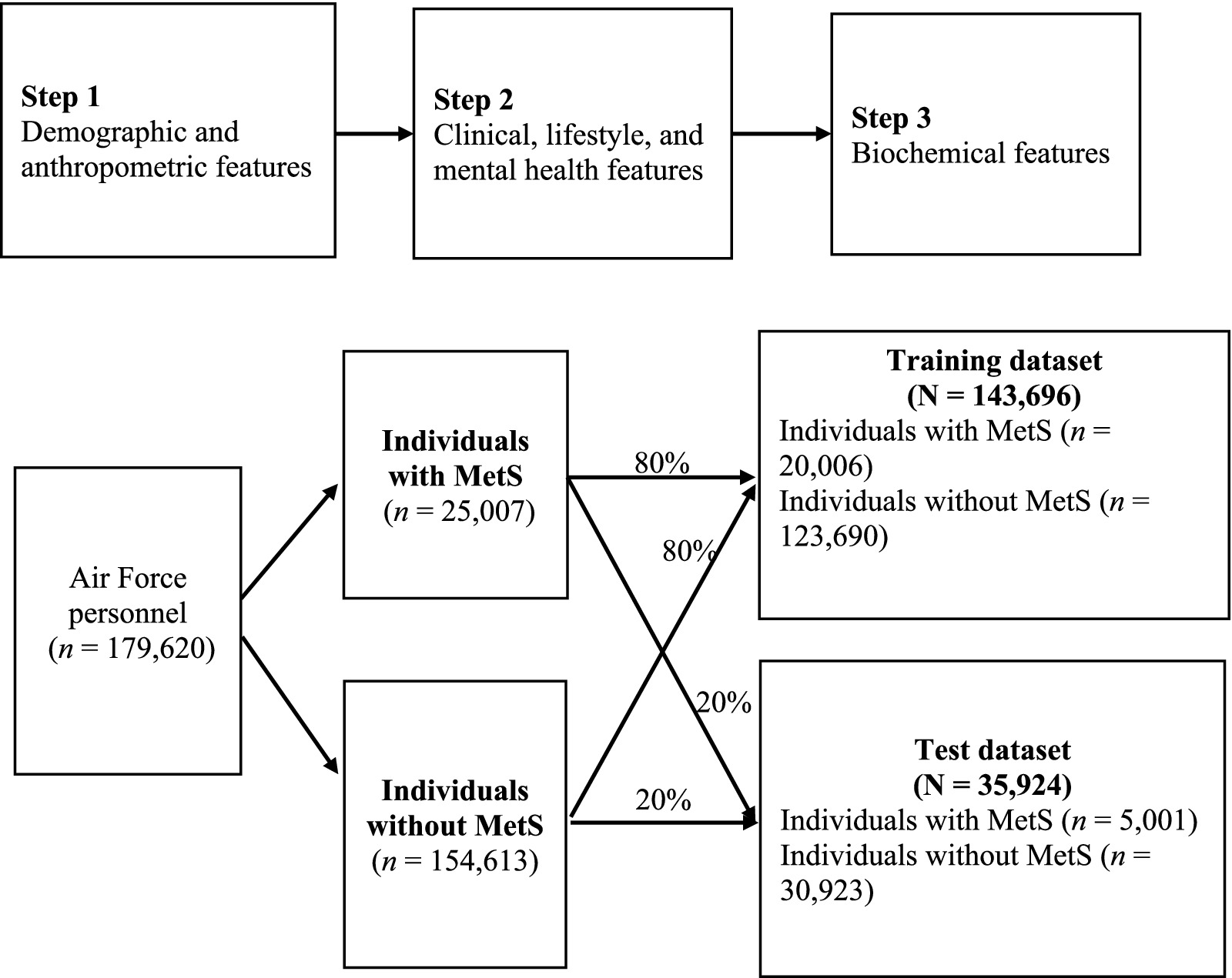 A total of 29 key features of MetS were included in the models in three sequential steps (Figure 1). The contribution of each feature to model performance was evaluated. The dataset was divided into MetS and non-MetS groups at an 80:20 ratio, yielding training and test datasets of 143,696 and 35,924 Air Force personnel, respectively. To address class imbalance, the synthetic minority oversampling technique (SMOTE) was applied exclusively to the training dataset prior to model development, while the test dataset was left unchanged to ensure unbiased evaluation (26). For comparison, we also assessed two other approaches, adaptive synthetic sampling (ADASYN) and class weighting, both of which produced area under the receiver operating characteristic curve (AUC) values similar to those obtained with SMOTE (see Supplementary Table S1 for detailed results). Because SMOTE is well validated and widely applied in biomedical prediction research, it was selected as the primary method for handling class imbalance in this study.