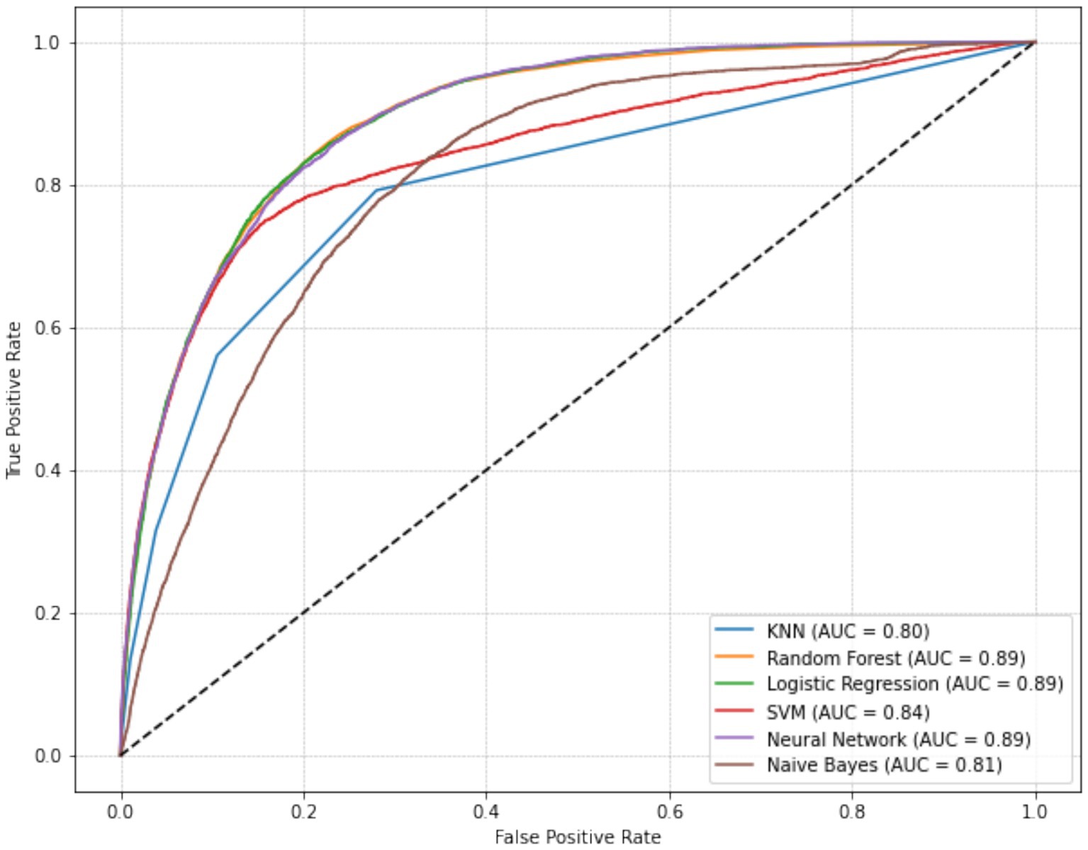 Figure 2. Receiver operating characteristic (ROC) curves of six machine learning models for predicting metabolic syndrome, with Logistic Regression achieving the highest AUC (0.894), followed by Random Forest, SVM, and Neural Network.