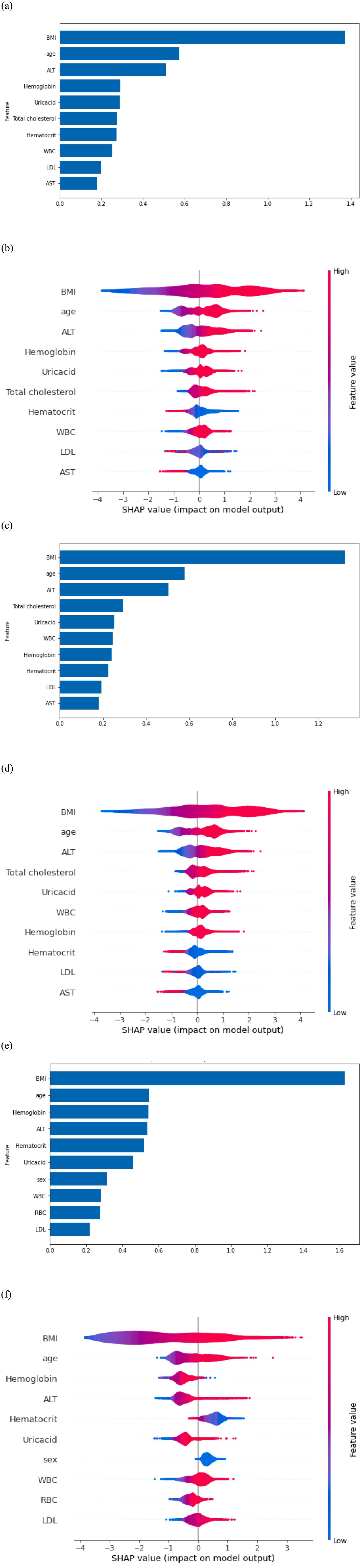 All six models passed the Hosmer–Lemeshow test, indicating good model fit. The top 10 predictive features for MetS identified by SHAP analysis are shown in Figure 3. Across the entire cohort, BMI, age, ALT level, hemoglobin, and uric acid were the five most strongly predictive features (Figures 3a,b). Features related to clinical, lifestyle, and mental health contributed minimally to the prediction. For men, BMI, age, ALT level, total cholesterol, and uric acid level were the most influential predictors (Figures 3c,d). For women, BMI, age, hemoglobin, ALT level, and hematocrit were the most predictive features (Figures 3e,f). Across both sexes, BMI, age, and ALT levels were consistently identified as the most influential predictors.