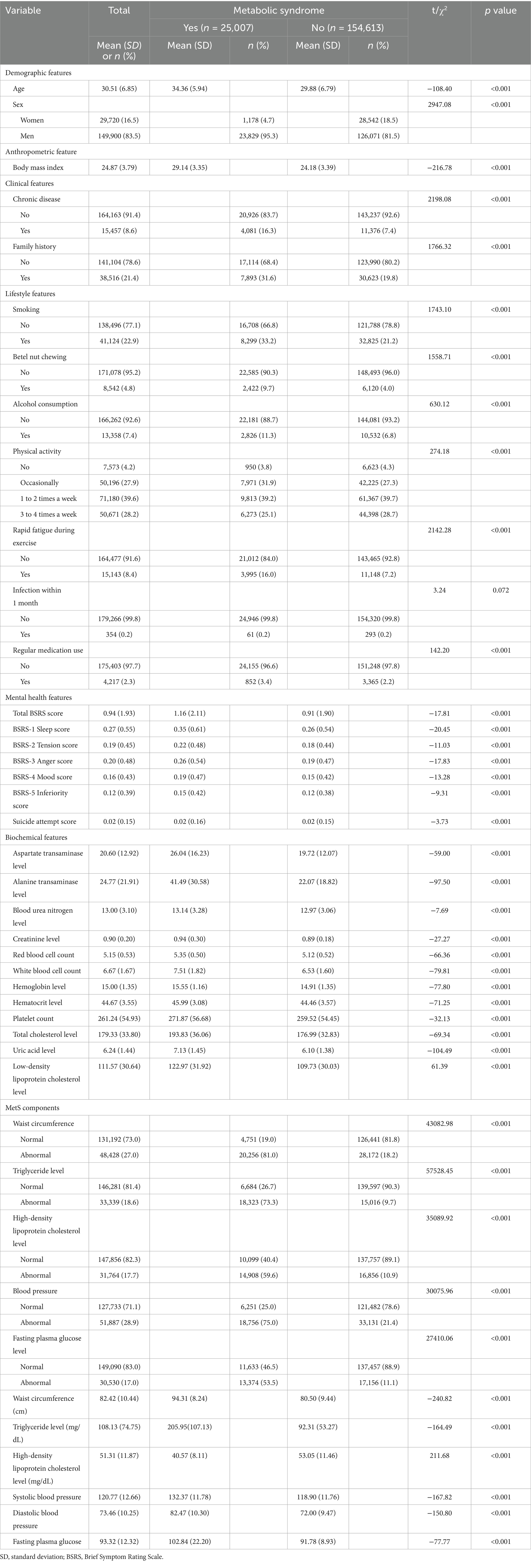 Clinical features included history of chronic disease, family history, and blood pressure (systolic and diastolic). Lifestyle features included smoking, betel nut use, alcohol consumption, physical activity, rapid fatigue during exercise, infection within 1 month, and regular medication use. The mental health features—insomnia, depression, hostility, anxiety, interpersonal sensitivity, and suicidal ideation—were assessed using the Brief Symptom Rating Scale-5 (BSRS-5), a validated five-item scale scored on a 5-point Likert scale (0–4) (23, 24). Higher scores indicated poorer psychological well-being. The Cronbach’s α value for the BSRS-5 ranges from 0.77 to 0.90 (23).
