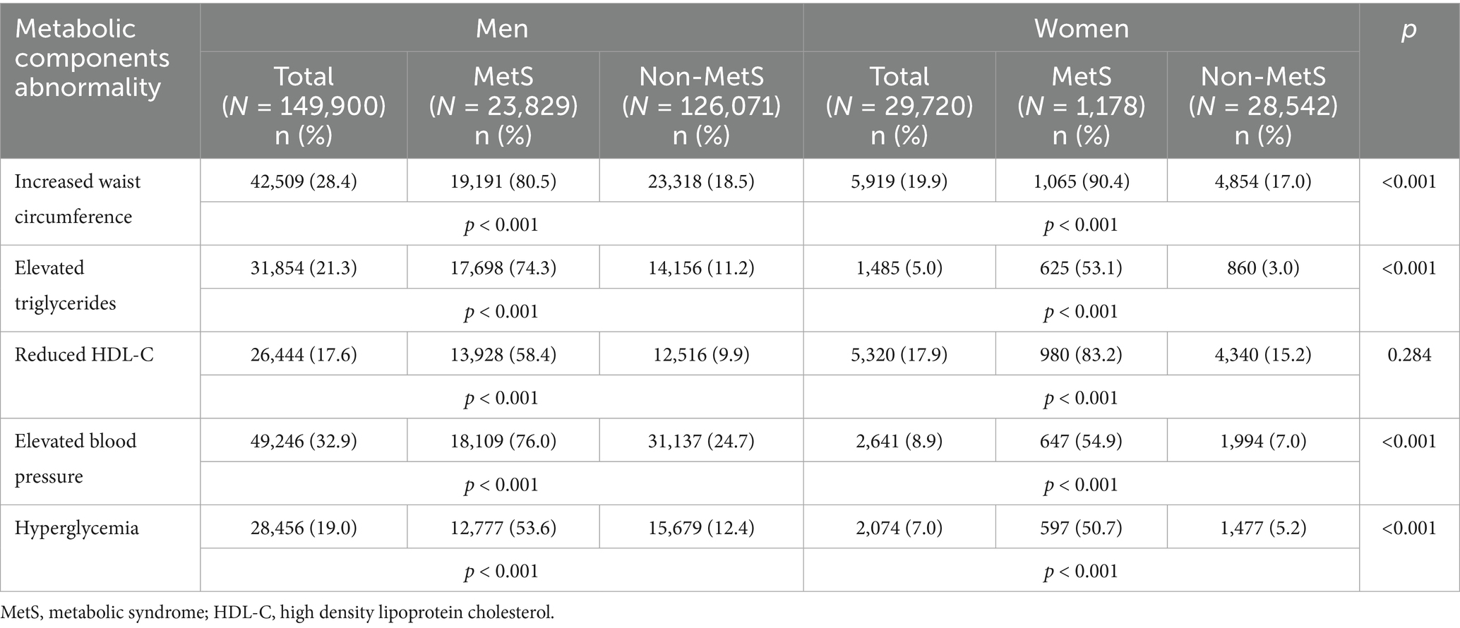 The chi-square test revealed sex-specific patterns in the prevalence of MetS and its component abnormalities (Table 2). Among men, the most common abnormality was elevated blood pressure (32.9%), followed by increased waist circumference (28.4%), elevated triglycerides (21.3%), hyperglycemia (19.0%), and reduced HDL-C (17.6%). In women, increased waist circumference was most prevalent (19.9%), followed by reduced HDL-C (17.9%), elevated blood pressure (8.9%), hyperglycemia (7.0%), and elevated triglycerides (5.0%).