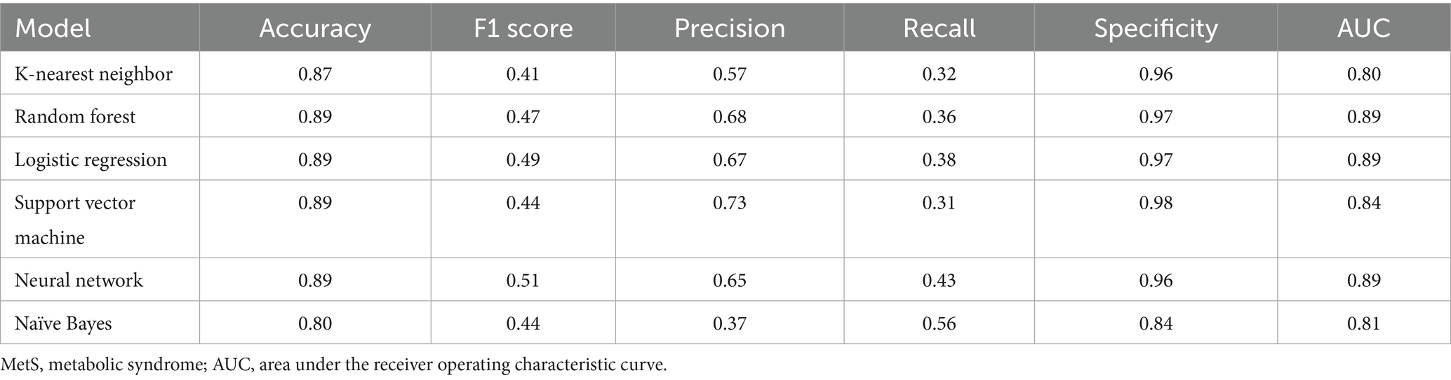 The six machine learning models demonstrated accuracies ranging from 0.80 to 0.89. Among them, the RF, LR, SVM, and NN models achieved the highest overall accuracy (0.89). The NN model had the highest F1 score (0.51), indicating balanced performance in precision and recall. The SVM model had the highest precision (0.73), followed by RF (0.68), LR (0.67), NN (0.65), KNN (0.57), and NB (0.37) models. The model recall values ranged from 0.31 to 0.56, and the specificity values ranged from 0.84 to 0.98 (Table 3).
