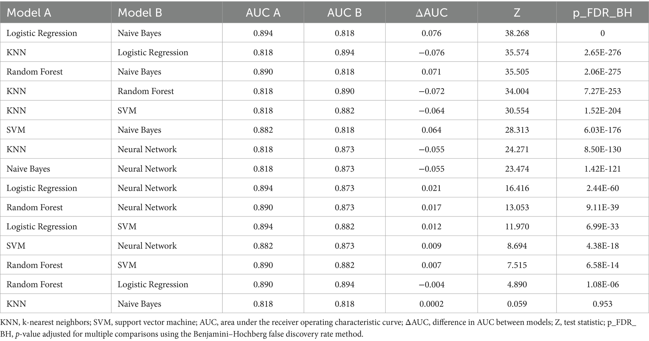 For predicting MetS events, the LR, RF, and NN models yielded the highest AUC values (all rounded to 0.89), followed by SVM (0.84), NB (0.81), and KNN (0.80; Figure 2). Pairwise comparisons using DeLong’s test indicated that LR achieved the highest AUC (0.894), significantly exceeding RF (0.890; ΔAUC = 0.004; p_FDR < 0.001) and NN (0.873; ΔAUC = 0.021; p_FDR < 0.001; Table 4). RF also significantly outperformed NN (ΔAUC = 0.017; p_FDR < 0.001). The overall performance ranking was LR > RF > SVM > NN, with all four significantly outperformed NN and NB (all p_FDR < 0.001). Although the absolute AUC differences among LR, RF, and NN were small (≤0.021), they remained statistically significant after multiple-comparison adjustment.