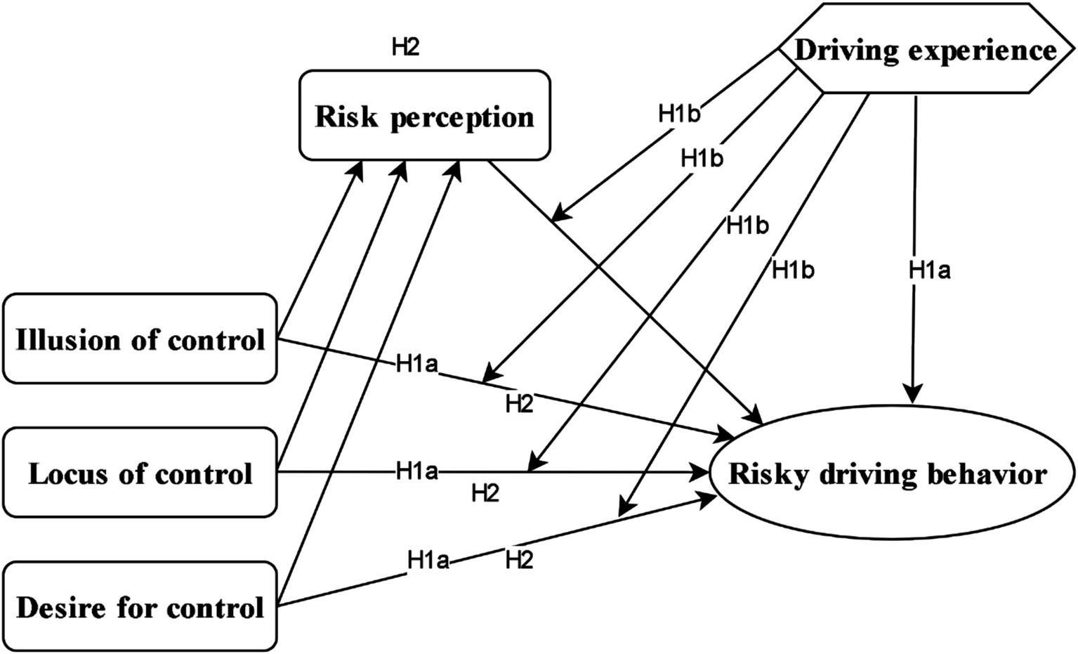 1. Hypothesis: Perceived invulnerability (i.e., illusion of control, desire for control, and risk perception) predicts risky driving behavior (H1a), with driving experience moderating these relationships (H1b).